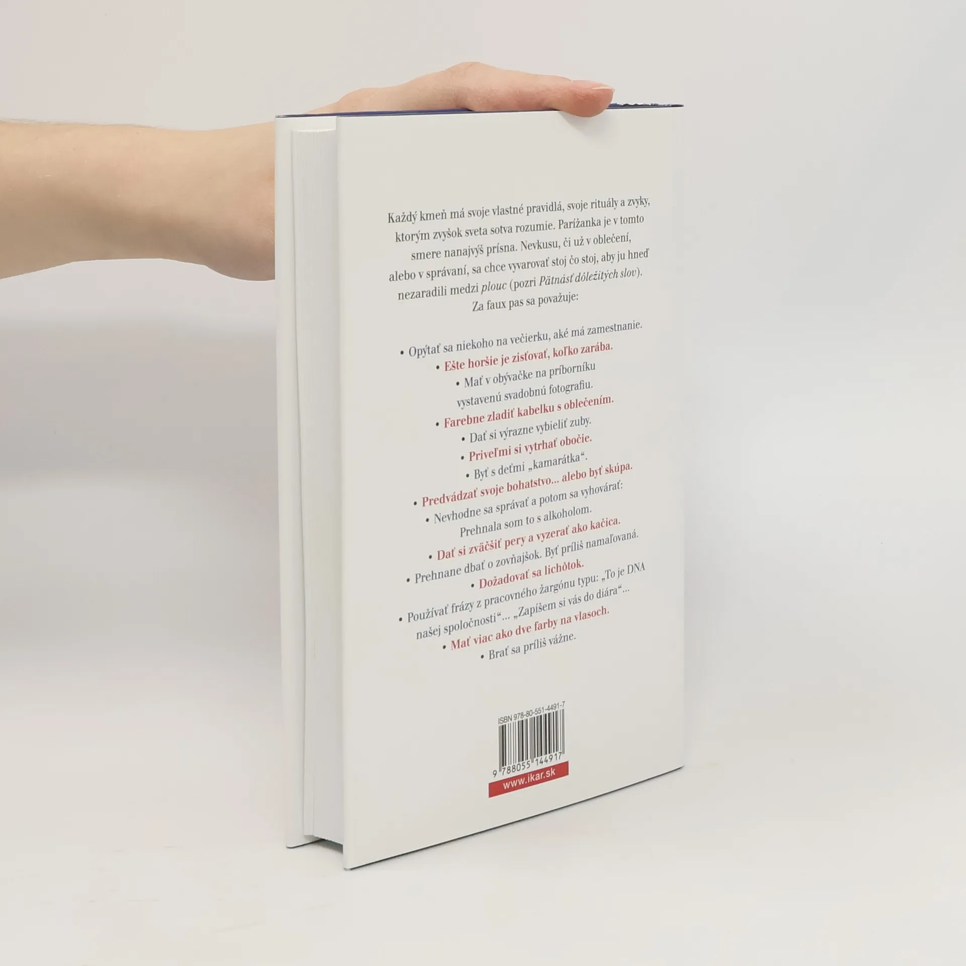 Štyri krásne a uznávané Francúzky, nerozlučné priateľky Anne Berestová, Audrey Diwanová, Carolinede Maigretová a Sophie Masová vám prezradia, čo znamená byť Parížankou: ako sa obliekať, užívať si život, zabávať sa – a to všetko s osobitým šarmom. Spoznáte ich nevšedné názory na módu, štýl, krásu, kultúru aj vzťahy s mužmi. Tieto talentované ženy, úspešné vo svete hudby, filmu, módy a médií, otvorene rozprávajú o tom, čo v súčasnosti znamená byť Francúzkami, a búrajú dlho pestované mýty. Prezrádzajú svoje tajomstvá, odkrývajú nedostatky a zároveň nás zabávajú svojimi komplikovanými a často protichodnými názormi a pocitmi. Netaja, že ich láka snobský svet kaviáru a šampanského, že sú trochu sebecké a nevyspytateľné, ale vždy sa na ne možno spoľahnúť. Sú panovačné a tvrdohlavé, no v hĺbke duše ostávajú romantické a nežné. Tieto pravé Parížanky vás zoberú na rande aj na večierok, ukážu vám šik miesta v meste svetiel a pozvú vás k sebe na večeru. Stanete sa jednou z nich. Pripravte sa na vzrušujúcu jazdu plnú prekvapení na francúzsky spôsob. Dozviete sa, ako byť záhadná a zmyselná či ako vyzerať prirodzene a neodolateľne tak, že sa vášmu partnerovi roztrasú kolená. Porozprávajú vám, aké sú matky, čo si myslia o svadbe alebo pravidelnom cvičení. Anne, Audrey, Caroline a Sophie vás rozosmejú a povzbudia, aby ste sa nebáli kráčať odvážne a slobodne, no najmä aby ste sa stále cítili dobre.