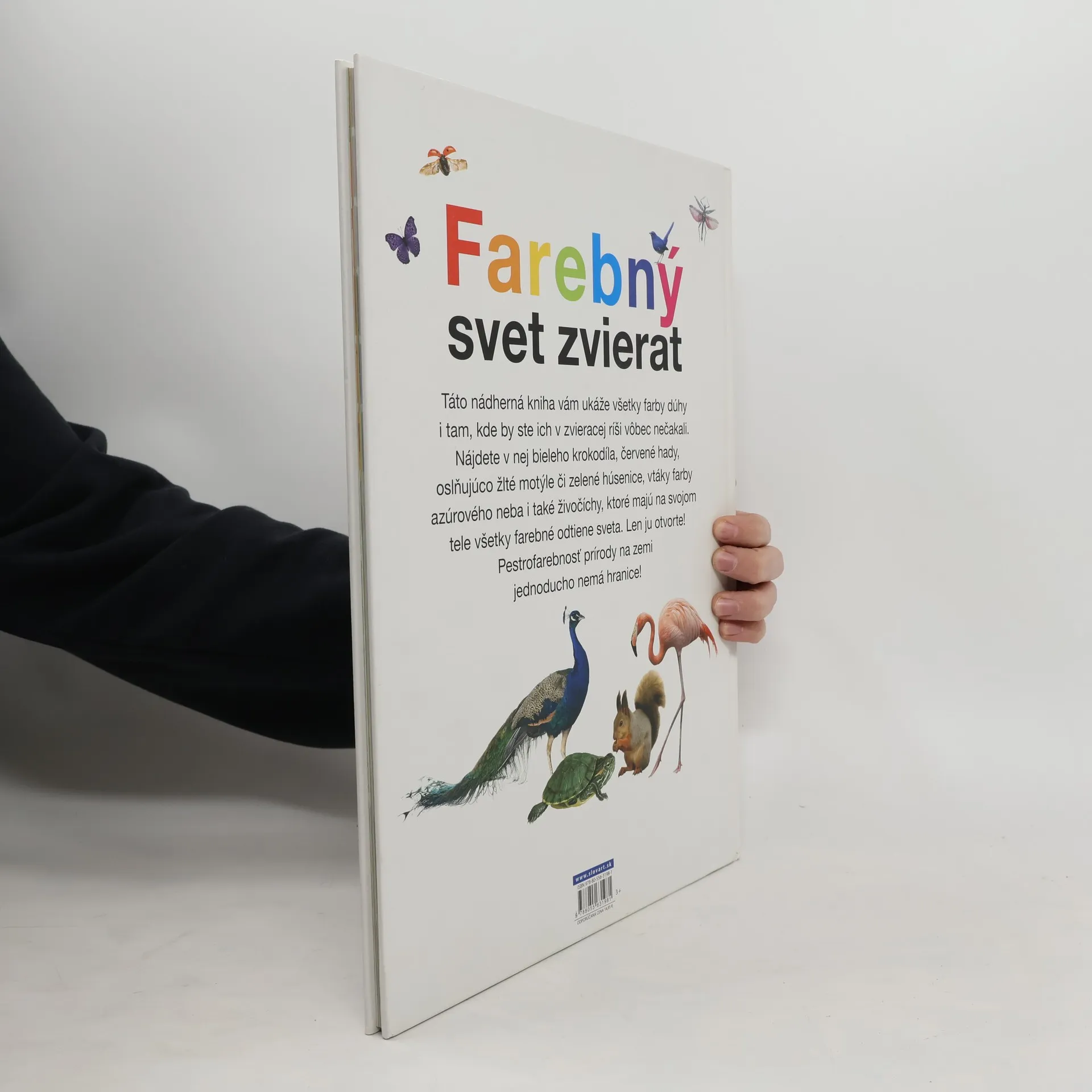Kniha Farebný svet zvierat vás prevedie všetkými farbami dúhy v zvieracej ríši. Nájdete v nej alabastrového krokodíla, žiarivé červené hady, oslňujúco žlté i zelené motýle aj húsenice, vtáky farby azúrového neba i také živočíchy, ktoré majú na svojom tele vystriedané všetky odtiene farebného spektra. Krásne farebné fotografie očaria deti aj dospelých. Pri čítaní tejto knihy skrátka každý zistí, že kráľovstvo zvierat je jednoducho najkrajšie na svete.