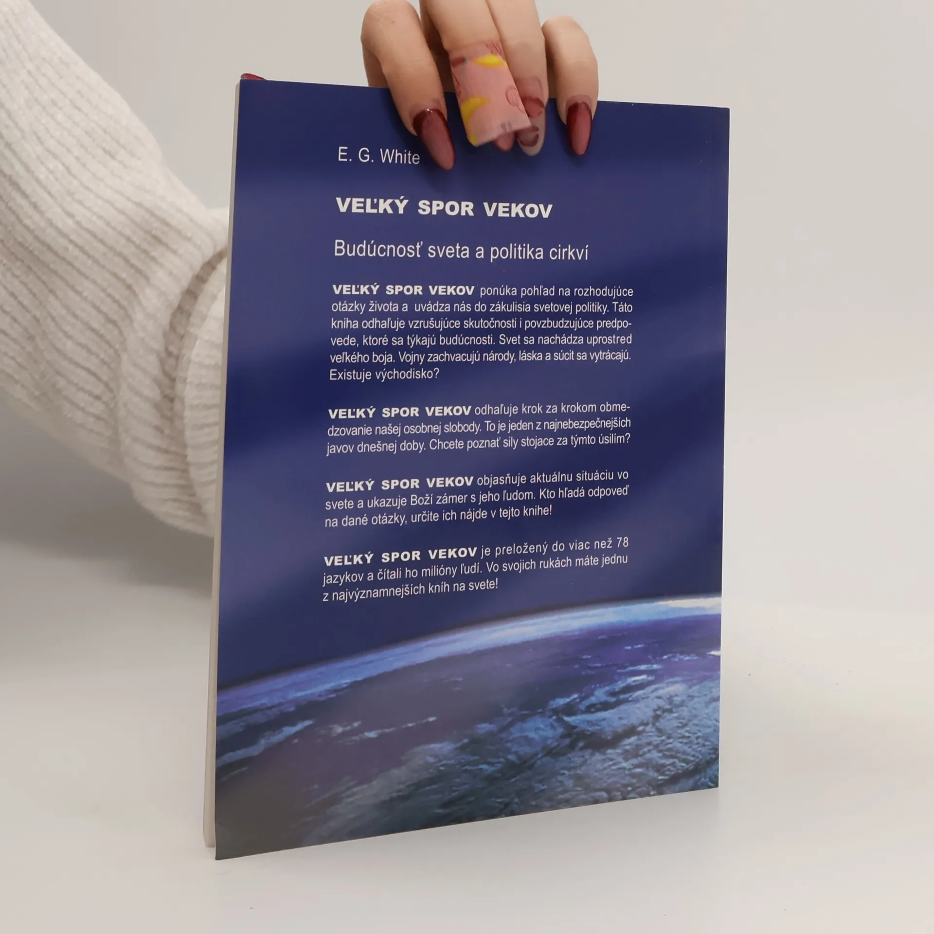 Biblická budúcnosť sveta. Veľký spor vekov ponúka pohľad na rozhodujúce otázky života a uvádza nás do zákulisia svetovej politiky. Táto kniha odhaľuje vzrušujúce skutočnosti i povzbudzujúce predpovede, ktoré sa týkajú budúcnosti. Svet sa nachádza uprostred veľkého boja. Vojny zachvacujú národy, láska a súcit sa vytrácajú. Existuje východisko? Veľký spor vekov odhaľuje krok za krokom obmedzovanie našej osobnej slobody. To je jeden z najnebezpečnejších javov dnešnej doby. Chcete poznať sily stojace za týmto úsilím? Veľký spor vekov objasňuje aktuálnu situáciu vo svete a ukazuje Boží zámer s jeho ľudom. Kto hľadá odpoveď na dané otázky, určite ich nájde v tejto knihe! Veľký spor vekov je preložený do viac než 78 jazykov a čítali ho milióny ľudí. Vo svojich rukách máte jednu z najvýznamnejších kníh na svete!
