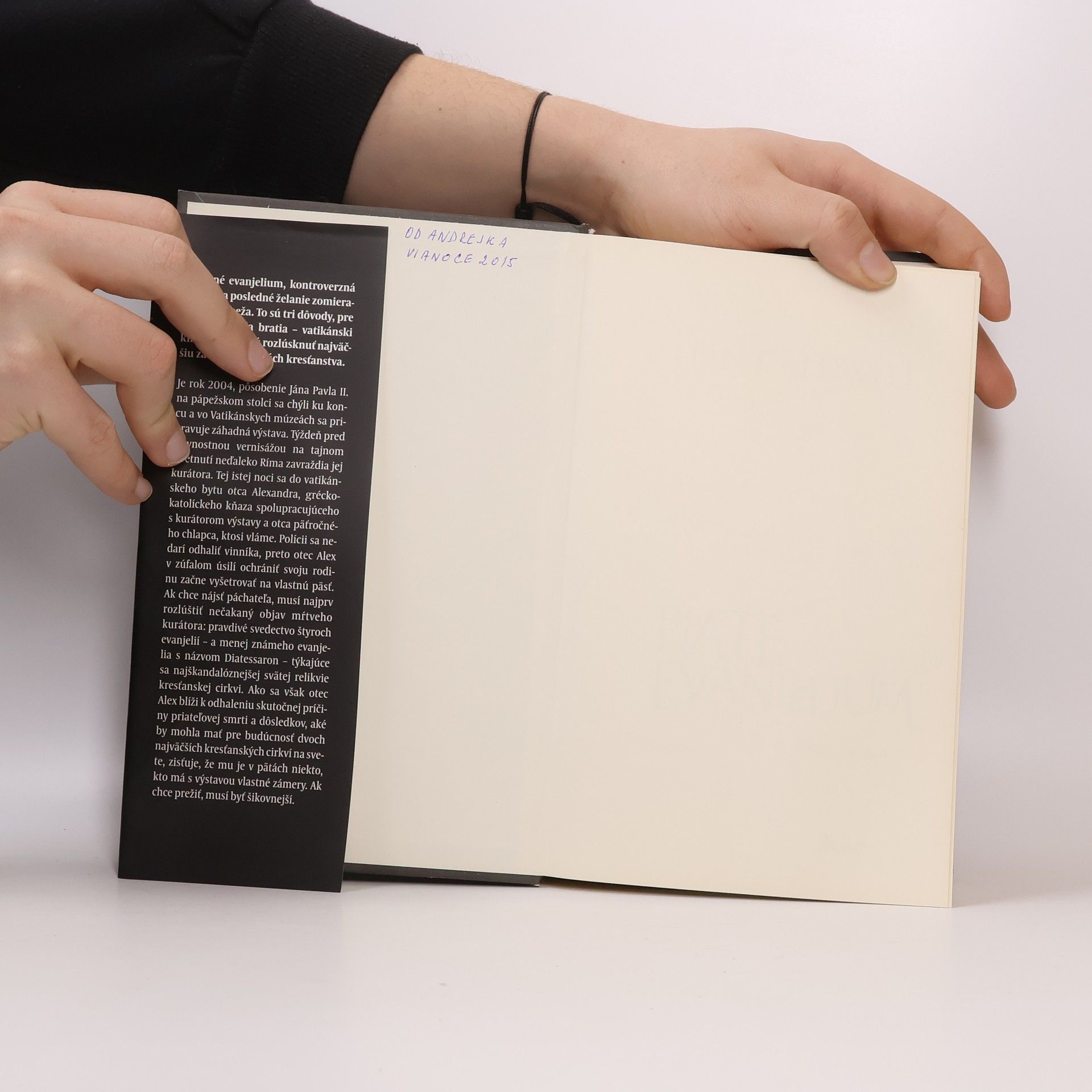 Stratené evanjelium, kontroverzná relikvia a posledné želanie zomierajúceho pápeža. To sú tri dôvody, pre ktoré sa dvaja bratia – vatikánski kňazi – podujmú rozlúsknuť najväčšiu záhadu v dejinách kresťanstva. Je rok 2004, pôsobenie Jána Pavla II. na pápežskom stolci sa chýli ku koncu a vo Vatikánskych múzeách sa pripravuje záhadná výstava. Týždeň pred slávnostnou vernisážou na tajnom stretnutí neďaleko Ríma zavraždia jej kurátora. Tej istej noci sa do vatikánskeho bytu otca Alexandra, gréckokatolíckeho kňaza spolupracujúceho s kurátorom výstavy a otca päťročného chlapca, ktosi vláme. Polícii sa nedarí odhaliť vinníka, preto otec Alex v zúfalom úsilí ochrániť svoju rodinu začne vyšetrovať na vlastnú päsť. Ak chce nájsť páchateľa, musí najprv rozlúštiť tajomný objav mŕtveho kurátora: pravdivé svedectvo štyroch evanjelií – a menej známeho evanjelia s názvom Diatessaron týkajúce sa najškandalóznejšej svätej relikvie kresťanskej cirkvi. Ako sa však otec Alex blíži k odhaleniu skutočnej príčiny priateľovej smrti a dôsledkov, aké by mohla mať na budúcnosť dvoch najväčších kresťanských cirkví na svete, zisťuje, že mu je v pätách niekto, kto má s výstavou vlastné zámery. Ak chce prežiť, musí byť chytrejší.
