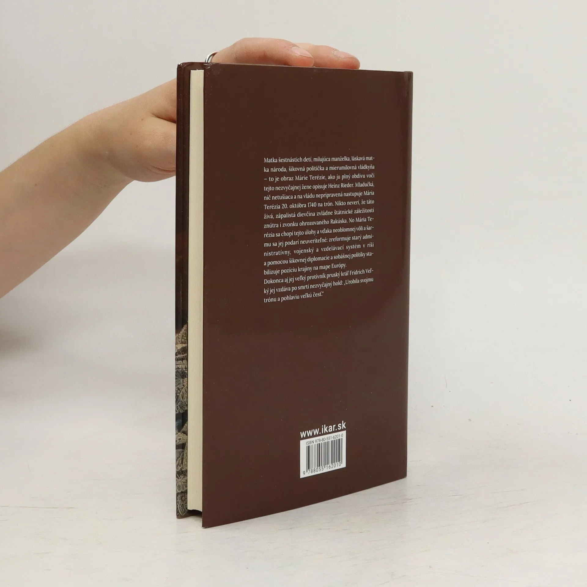 Matka šestnástich detí, milujúca manželka, láskavá matka národa, šikovná politička a mierumilovná vládkyňa? to je obraz Márie Terézie, ako ju plný obdivu voči tejto nezvyčajnej žene opisuje Heinz Rieder. Mladučká, nič netušiaca a na vládu nepripravená nastupuje Mária Terézia 20. októbra 1740 na trón. Nikto neverí, že táto živá, zápalistá dievčina zvládne štátnické záležitosti znútra i zvonku ohrozovaného Rakúska. No Mária Terézia sa chopí tejto úlohy a vďaka neoblomnej silnej vôli a šarmu sa jej podarí neuveriteľné: zreformuje starý administratívny, vojenský a vzdelávací systém v ríši a pomocou šikovnej diplomacie a sobášnej politiky stabilizuje pozíciu krajiny na mape Európy. Dokonca aj jej veľký protivník pruský kráľ Friedrich Veľký jej vzdáva po smrti nezvyčajný hold: „Urobila svojmu trónu a pohlaviu veľkú česť.“