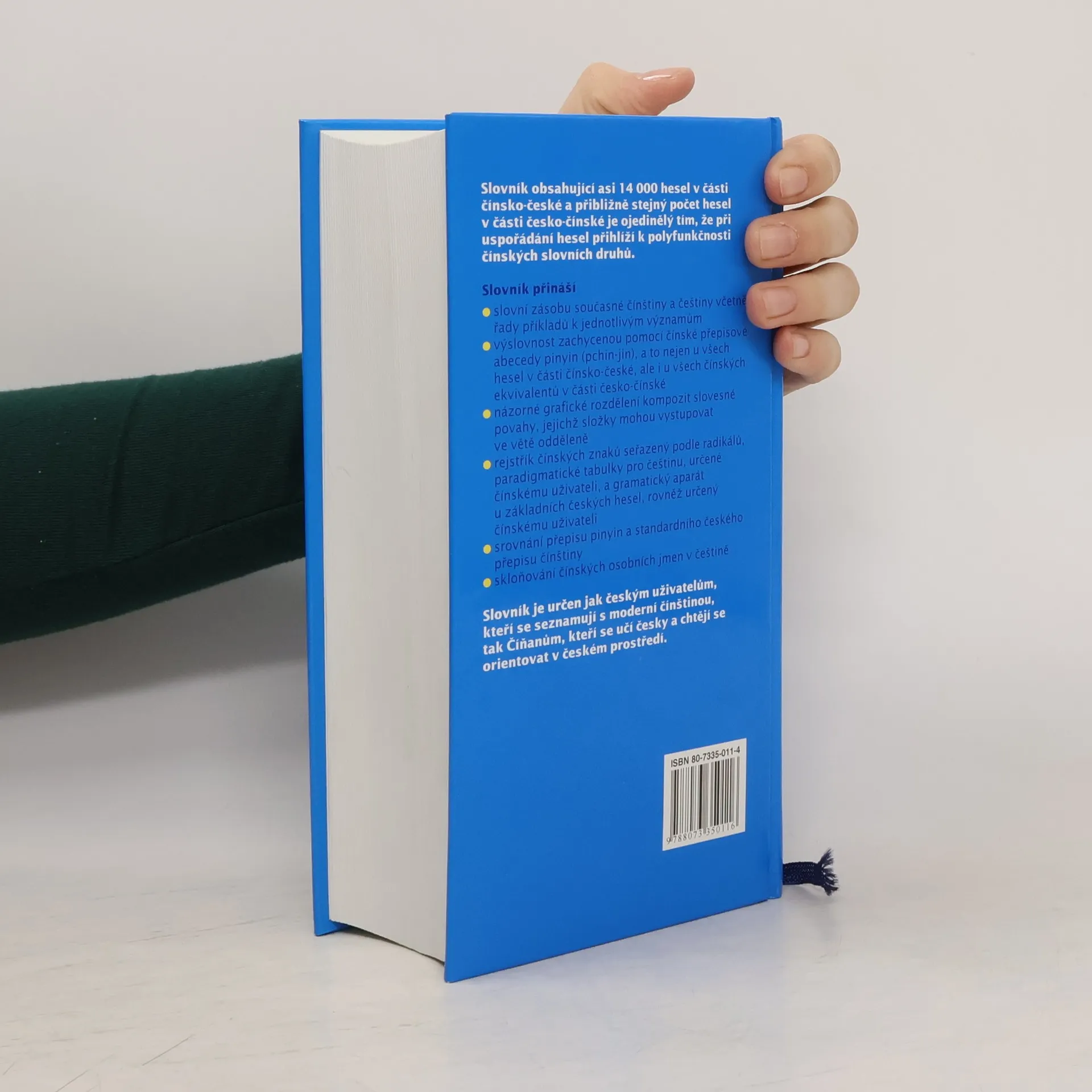 Slovník obsahující asi 14 000 hesel v části čínsko-české a přibližně stejný počet hesel v části česko-čínské je ojedinělý tím, že při uspořádání hesel přihlíží k polyfunkčnosti čínských slovních druhů. Slovník přináší: - slovní zásobu současné čínštiny a češtiny včetně řady příkladů k jednotlivým významům - výslovnost zachycenou pomocí čínské přepisové abecedy pinyin (pchin-jin), a to nejen u všech hesel v části čínsko-české, ale i u všech čínských ekvivalentů v části česko-čínské - názorné grafické rozdělení kompozit slovesné povahy, jejichž složky mohou vystupovat ve větě odděleně - rejstřík čínských znaků seřazený podle radikálů - paradigmatické tabulky pro češtinu, určené čínskému uživateli, a gramatický aparát u základních českých hesel, rovněž určený čínskému uživateli - srovnání přepisu pinyin a standardního českého přepisu čínštiny - skloňování čínských osobních jmen v češtině Slovník je určen jak českým uživatelům, kteří se seznamují s moderní čínštinou, tak čínským uživatelům, kteří se učí česky a chtějí se orientovat v českém prostředí.