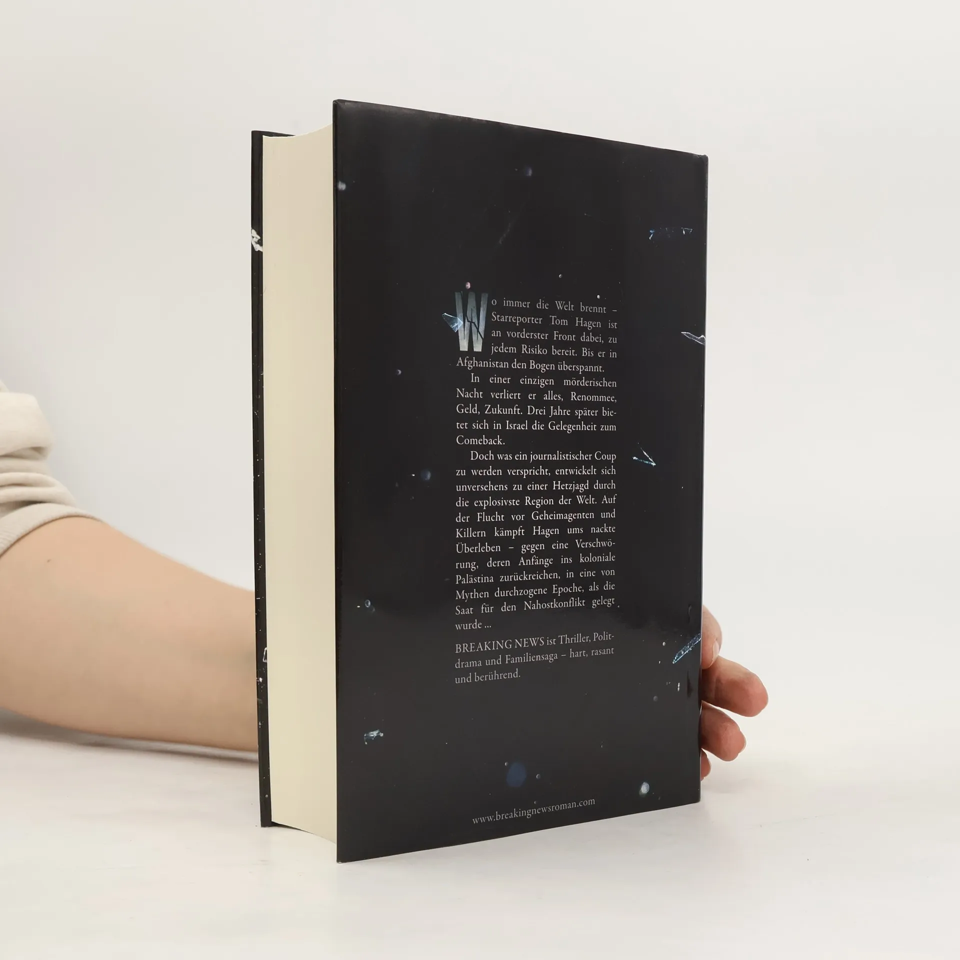 Thriller, Politdrama und Familiensaga – hart, rasant und berührend. Tom Hagen, gefeierter Star unter den Krisenberichterstattern, ist nicht zimperlich, wenn es um eine gute Story geht. Die Länder des Nahen Ostens sind sein Spezialgebiet, seine Reportagen Berichte aus der Hölle. Doch in Afghanistan verlässt ihn sein Glück. Eine nächtliche Geiselbefreiung endet im Desaster. Hagens Ruf ist ruiniert, verzweifelt kämpft er um sein Comeback. Drei Jahre später bietet sich die Gelegenheit in Tel Aviv, als ihm Daten des israelischen Inlandgeheimdienstes zugespielt werden. Hagen ergreift die Chance - und setzt ungewollt eine tödliche Kettenreaktion in Gang... Breaking News ist ein mitreißender Thriller vor dem Hintergrund einer epischen Saga. Zwei Familien wandern Ende der zwanziger Jahre nach Palästina ein – in eine von Legenden, Kämpfen und Hoffnungen beherrschte neue Welt, wo Juden, Araber und britische Kolonialherren erbittert um die Vorherrschaft ringen. Bis in die Gegenwart, über Generationen hinweg, spiegeln und prägen beide Familien Israels atemlose Entwicklung. Als Hagen in der jungen Ärztin Yael Kahn eine unerwartete Verbündete findet, erkennt er, dass auch sein Schicksal eng mit der Geschichte des Landes verbunden ist. Doch mit Yael an seiner Seite gehen die Probleme erst richtig los.