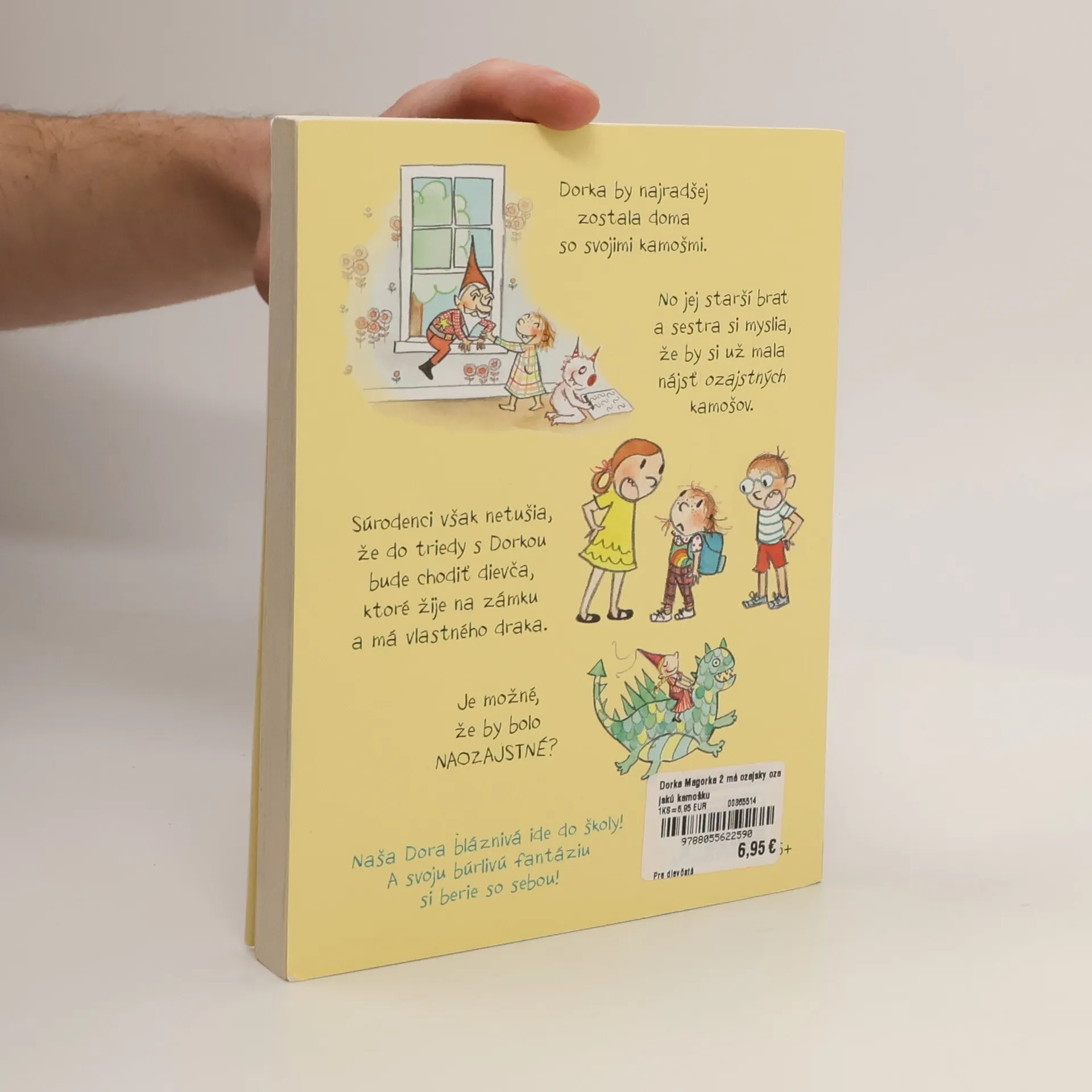 Prečítajte si druhé pokračovanie fantasticky fantazmagorických dobrodružstiev Dorky Magorky. Jej fantázia nepozná hraníc. Už sa nevie dočkať svojho prvého školského dňa. Teda, až kým jej súrodenci nepovedia, čo všetko sa tam nesmie robiť. Nesmie chodiť celý deň v pyžame, rozprávať sa sama so sebou, presúvať nábytok a stavať si pevnosť. Ale najhoršie je, že je tam prísne zakázané fantazmagoriť! Takže s ňou jej najlepšia kamoška Zorka nemôže ísť do školy. Našťastie v triede stretne dievčatko s rovnako bujnou fantáziou. Teraz už len musí všetkých presvedčiť, že si novú kamošku nevymyslela.