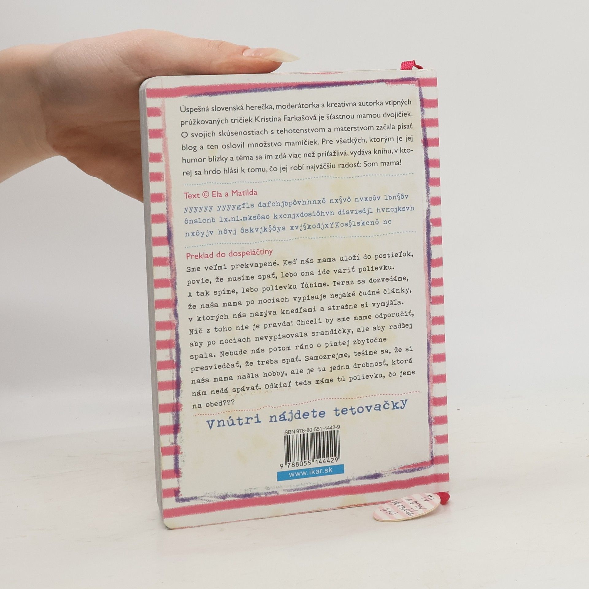 Úspešná slovenská herečka, moderátorka a kreatívna autorka vtipných prúžkovaných tričiek Kristína Farkašová je šťastnou mamou dvojičiek Ely a Matildy. O svojich skúsenostiach a zážitkoch s tehotenstvom a materstvom začala písať vtipný blog a ten oslovil množstvo mamičiek. Pre všetkých, ktorým je jej humor blízky a téma sa im zdá viac než príťažlivá, vydáva knihu, v ktorej sa hrdo hlási k tomu, čo jej robí najväčšiu radosť: Som mama! Ilustroval Boris Farkaš.