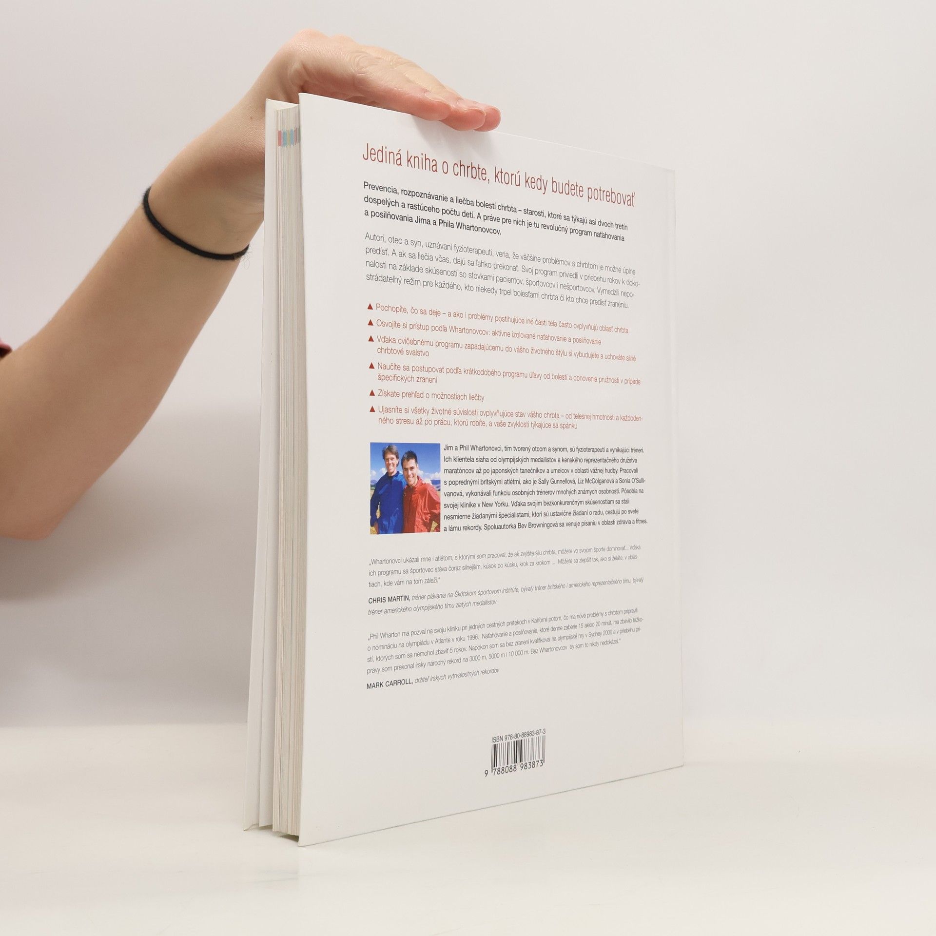 Kniha ponúka revolučný program naťahovania a posilňovania, ktorý pomáha predchádzať, rozpoznávať a liečiť bolesti chrbta, problém postihujúci mnohých dospelých a deti. Autori, uznávaní fyzioterapeuti Jim a Phil Whartonovci, veria, že väčšine problémov s chrbtom sa dá predísť a že ak sa liečia včas, sú ľahko zvládnuteľné. Ich program, založený na skúsenostiach s pacientmi a športovcami, ponúka nepostrádateľný režim pre každého, kto sa chce vyhnúť bolestiam chrbta. Čitatelia sa dozvedia, čo ovplyvňuje zdravie chrbta, vrátane súvislostí s inými časťami tela. Osvoja si aktívne izolované naťahovanie a posilňovanie, ktoré sa dajú integrovať do každodenného života. K dispozícii je aj krátkodobý program na úľavu od bolestí a obnovenie pružnosti pri špecifických zraneniach. Autori sa zaoberajú aj faktormi ako telesná hmotnosť, stres, práca a spánkové zvyky, ktoré ovplyvňujú stav chrbta. Jim a Phil Whartonovci sú známi fyzioterapeuti, ktorí pracovali s olympijskými medailistami a elitnými športovcami. Ich odborné znalosti a skúsenosti ich robia vyhľadávanými špecialistami. Spoluautorka Bev Browningová sa zameriava na zdravie a fitnes. Rôzni športovci potvrdzujú účinnosť ich programu, ktorý im pomohol prekonať zranenia a dosiahnuť úspechy.