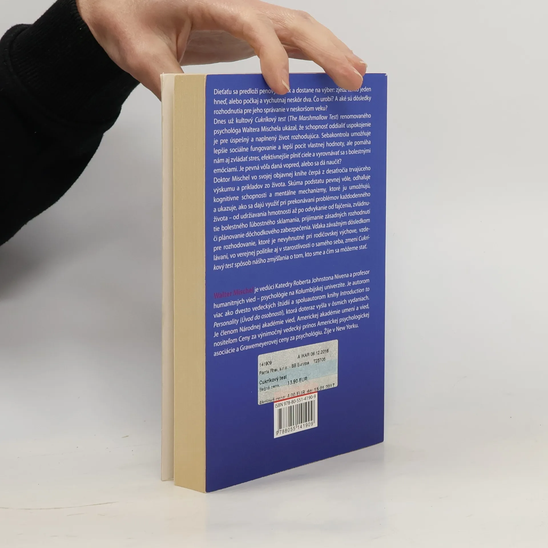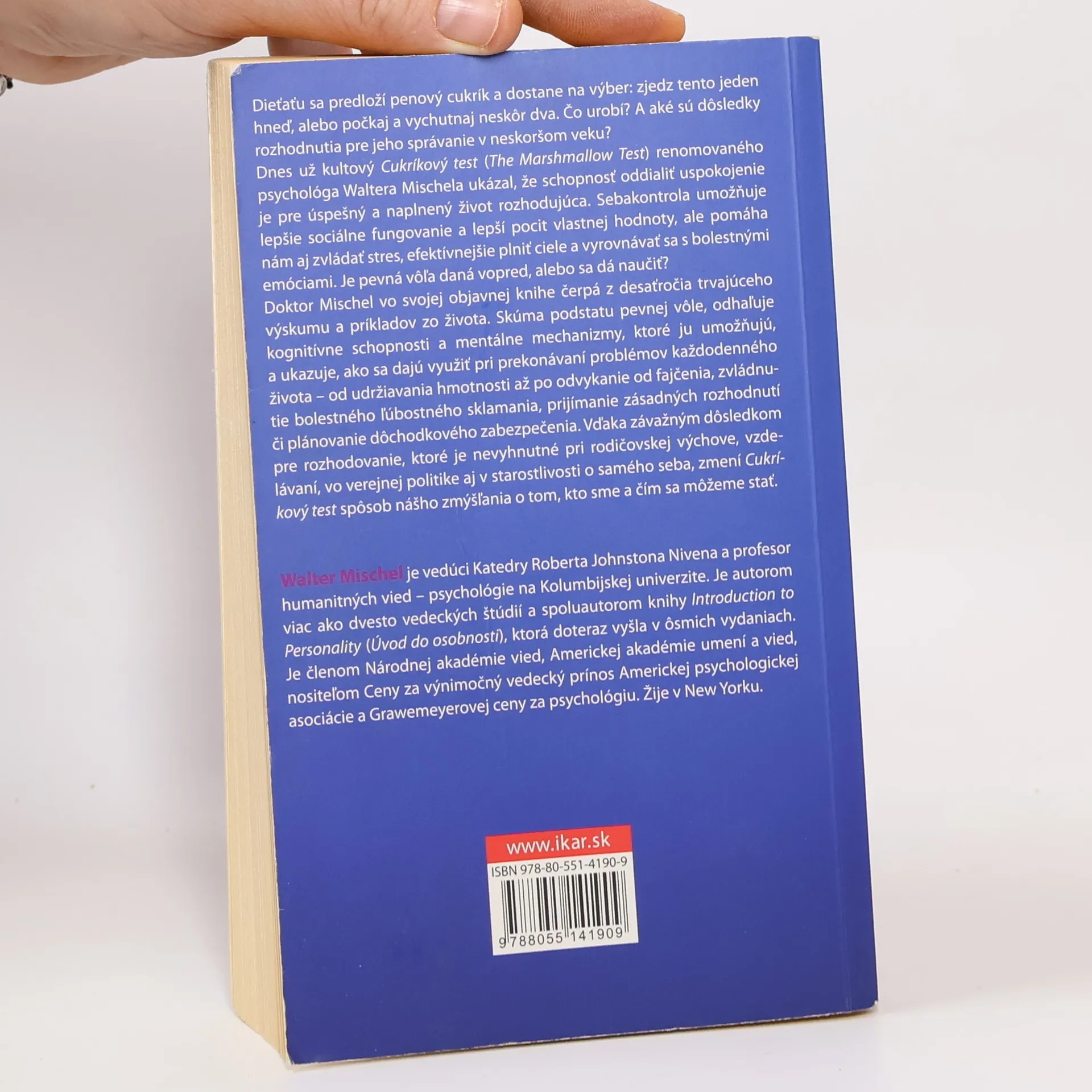 Dieťaťu sa predloží penový cukrík a dostane na výber: zjedz tento jeden hneď, alebo počkaj a vychutnaj neskôr dva. Čo urobí? A aké sú dôsledky rozhodnutia pre jeho správanie v neskoršom veku? Dnes už kultový Cukríkový test (The Marshmallow Test) renomovaného psychológa Waltera Mischela ukázal, že schopnosť oddialiť uspokojenie je pre úspešný a naplnený život rozhodujúca. Sebakontrola umožňuje lepšie sociálne fungovanie a lepší pocit vlastnej hodnoty, ale pomáha nám aj zvládať stres, efektívnejšie plniť ciele a vyrovnávať sa s bolestnými emóciami. Je pevná vôľa daná vopred, alebo sa dá naučiť? Doktor Mischel vo svojej objavnej knihe čerpá z desaťročia trvajúceho výskumu a príkladov zo života. Skúma podstatu pevnej vôle, odhaľuje kognitívne schopnosti a mentálne mechanizmy, ktoré ju umožňujú, a ukazuje, ako sa dajú využiť pri prekonávaní problémov každodenného života – od udržiavania hmotnosti až po odvykanie od fajčenia, zvládnutie bolestného ľúbostného sklamania, prijímanie zásadných rozhodnutí či plánovanie dôchodkového zabezpečenia. Vďaka závažným dôsledkom pre rozhodovanie, ktoré je nevyhnutné pri rodičovskej starostlivosti, vzdelávaní, vo verejnej politike aj v starostlivosti o samého seba, zmení Cukríkový test spôsob nášho zmýšľania o tom, kto sme a čím sa môžeme stať.