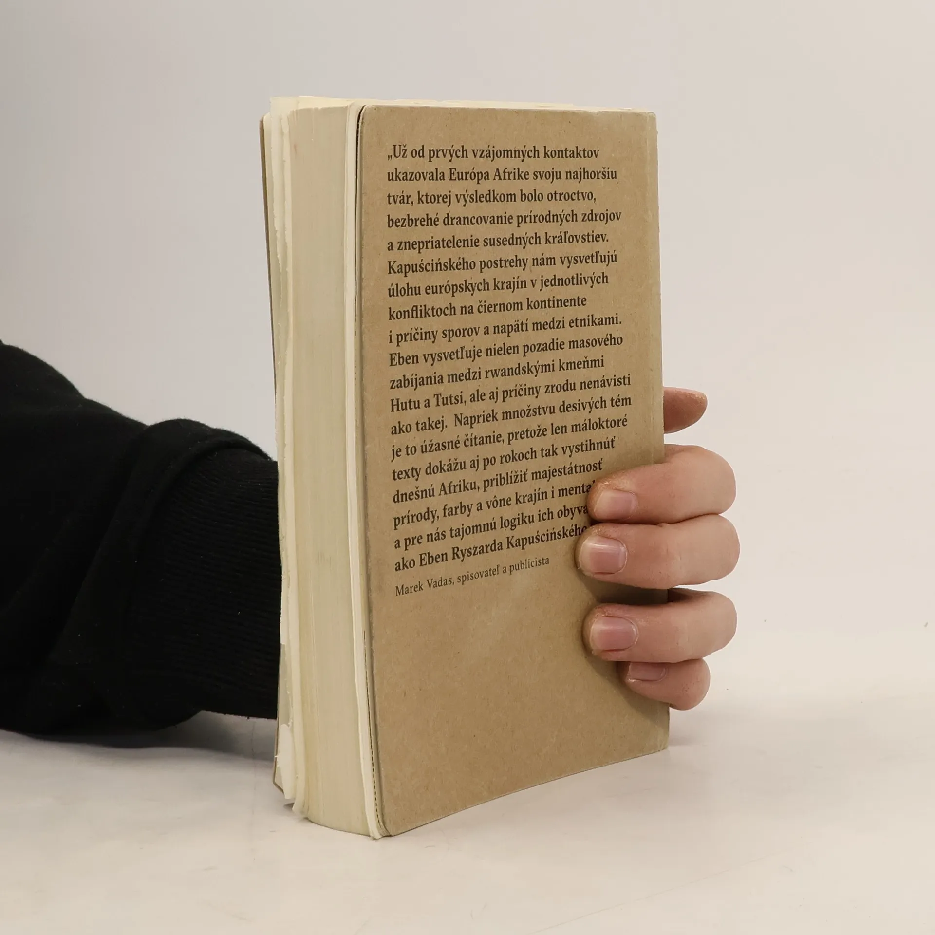 Vďaka Kapuścińského knihe Eben pochopíme, akú hodnotu má hrsť ryže, hlt vody, prievan a kúsok tieňatam, kde človek musí denno-denne bojovať o holý život. Eben nie je rozprávaním o neznámej Afrike. Naopak – Afrika v Kapuścińského podaní je čímsi dôverne známym. Kapuściński v Afrike totiž dlhé roky skutočne žil, prenikal do jej podstaty, žil s ľuďmi, žil Afriku. A tak o Afrike dokáže aj rozprávať. „Už od prvých kontaktov ukazovala Európa Afrike svoju najhoršiu tvár, ktorej výsledkom bolo otroctvo, bezbrehé drancovanie prírodných zdrojov a znepriatelenie susedných kráľovstiev. Kapuścińského postrehy nám vysvetľujú úlohu európskych krajín v jednotlivých konfliktoch na čiernom kontinente i príčiny sporov a napätí medzi etnikami. Pomáhajú nám dať do súvislostí udalosti dnešnej migračnej krízy či mnohých nedávnych i súčasných vojen. Eben vysvetľuje pozadie masového zabíjania medzi rwandskými kmeňmi Hutu a Tutsi, ale aj príčiny zrodu nenávisti vo všeobecnosti. Napriek množstvu desivých tém je to úžasné čítanie, pretože len máloktoré texty dokážu aj po rokoch tak vystihnúť dnešnú Afriku, priblížiť majestátnosť prírody, farby a vône krajín i mentalitu a pre nás tajomnú logiku ich obyvateľov, ako Eben Ryszarda Kapuścińského.“