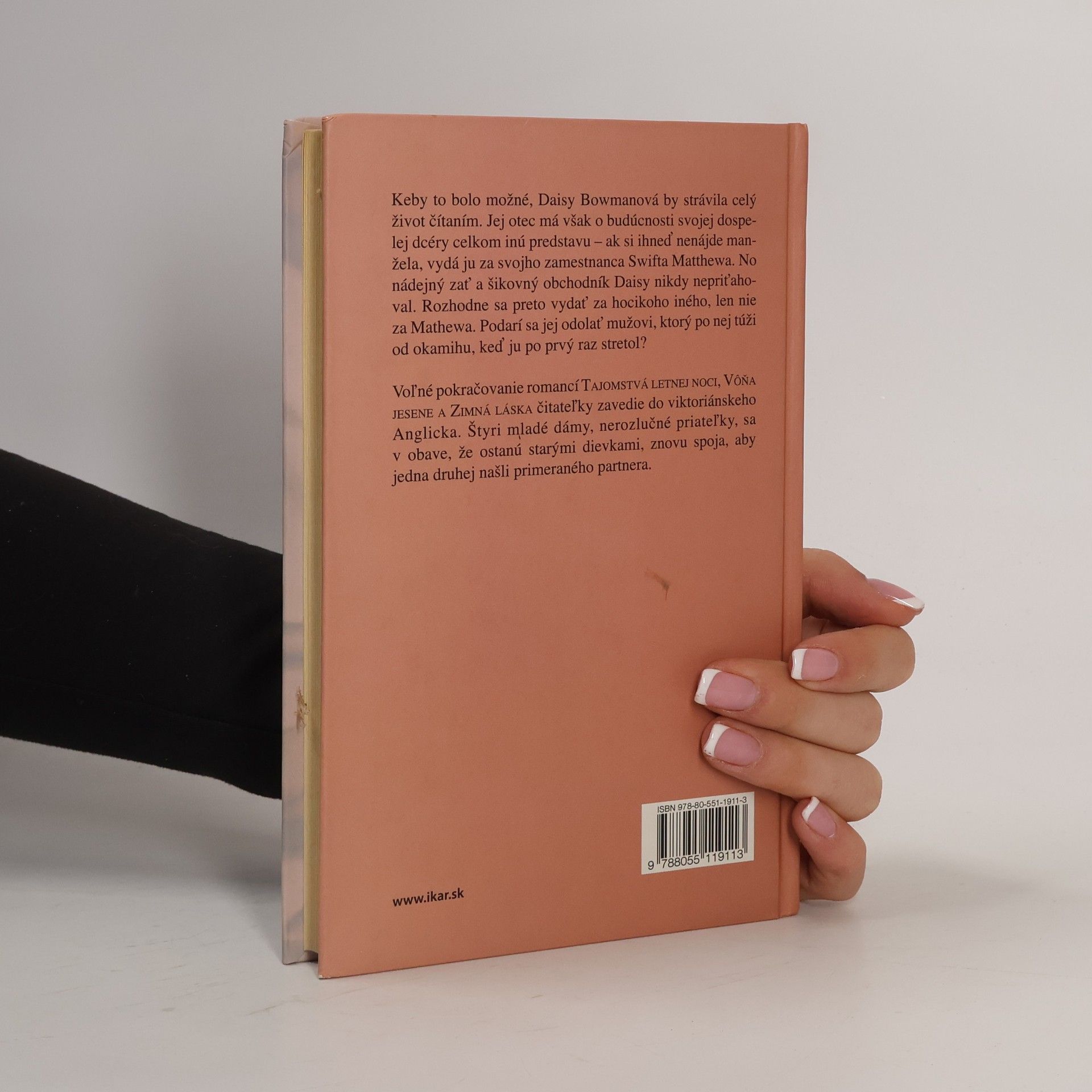 Keby to bolo možné, Daisy Bowmanová by strávila celý život čítaním. Jej otec má však o budúcnosti svojej dospelej dcéry celkom inú predstavu – ak si ihneď nenájde manžela, vydá ju za svojho zamestnanca Swifta Matthewa. No nádejný zať a šikovný obchodník Daisy nikdy nepriťahoval. Rozhodne sa preto vydať za hocikoho iného, len nie za Mathewa. Podarí sa jej odolať mužovi, ktorý po nej túži od okamihu, keď ju po prvý raz stretol? Voľné pokračovanie romancí Tajomstvá letnej noci, Vôňa jesene a Zimná láska čitateľky zavedie do viktoriánskeho Anglicka. Štyri mladé dámy, nerozlučné priateľky, sa v obave, že ostanú starými dievkami, znovu spoja, aby jedna druhej našli primeraného partnera.