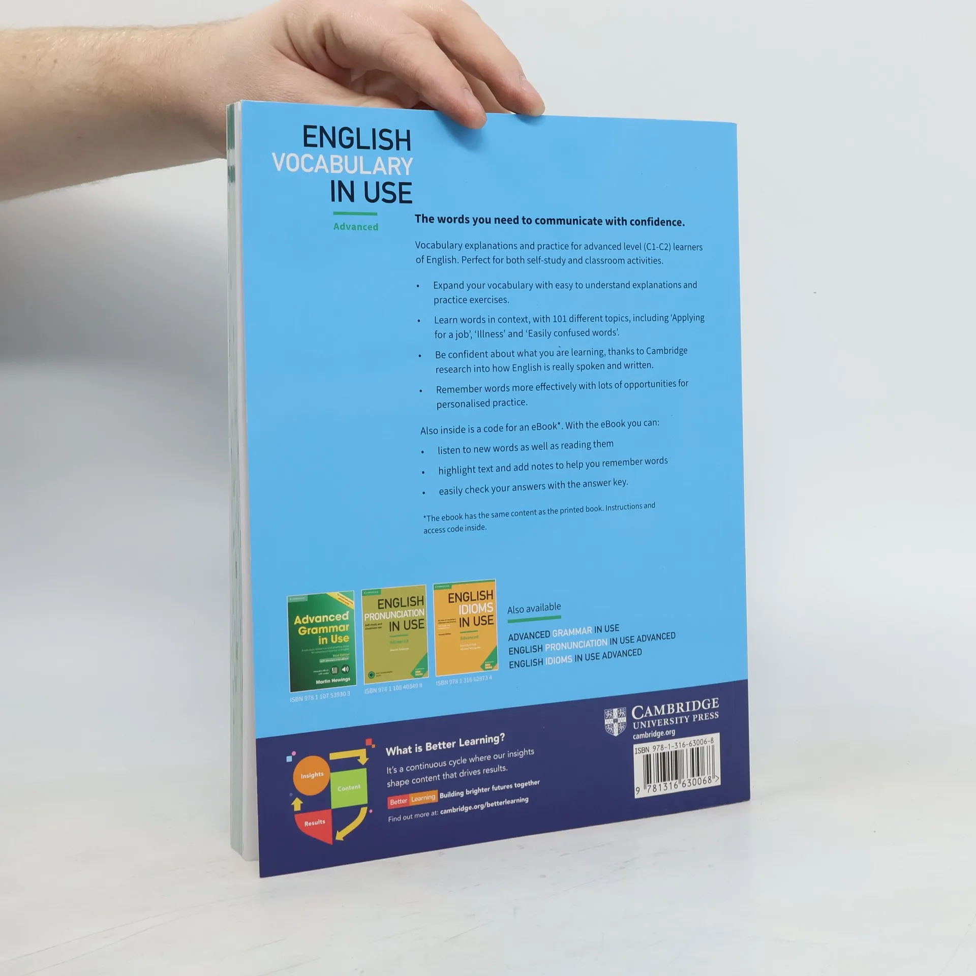 The words you need to communicate with confidence. Vocabulary explanations and practice for advanced level (C1 to C2) learners of English. Perfect for both self-study and classroom activities. Quickly expand your vocabulary with over 100 units of easy to understand explanations and practice exercises. Be confident about what you are learning, thanks to Cambridge research into how English is really spoken and written, and remember words more effectively with lots of opportunities for personalised practice.