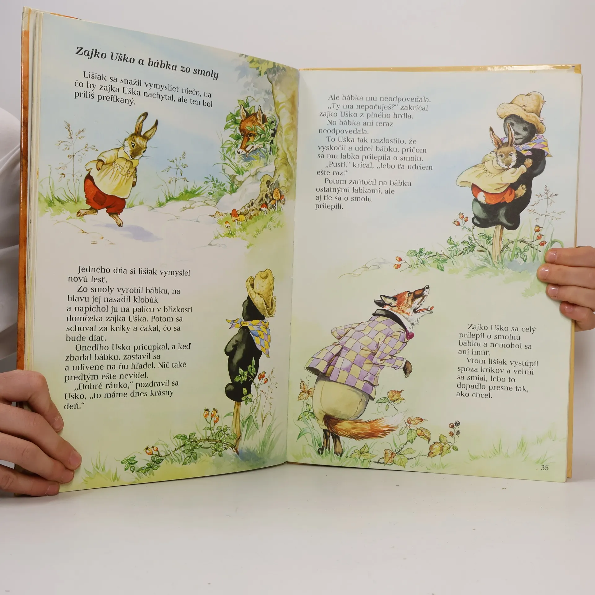 Príhody zajka Uška v príbehoch: Ako korytnačka dokázala všetkým svoju silu, Zajko Uško nakupuje, Zajko Uško a prefíkaný jastrab, Zajko Uško a lev, Zajko Uško jazdcom, Ako zajko lišiaka opäť prekabátil, Zajko Uško a lišiak, Zajko Uško a bábka zo smoly, Zajko Uško a korytnačka, Zajko Uško a lišiak na rybačke, Veľké preteky, Lišiak na poľovačke, Ako zajko Uško o chvost prišiel, Zajko Uško a medveď, Lišiak a hus, Mesiac v rybníku, Zajko Uško a krčah s medom, Ako vlk porušil zákon.