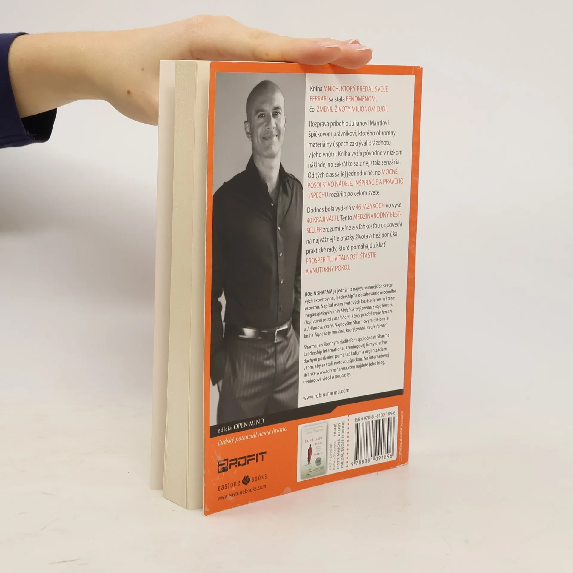 Mních, ktorý predal svoje Ferrari, je kniha, ktorá sa stala fenoménom. Vyšla pred desiatimi rokmi a odvtedy zmenila miliónom ľudí život. Rozpráva príbeh o Julianovi Mantlovi, špičkovom právnikovi, ktorého ohromný materiálny úspech zakrýval prázdnotu v jeho vnútri. Kniha vyšla pôvodne v nízkom náklade, no zakrátko sa z nej stala senzácia. Od tých čias sa jej jednoduché, no mocné posolstvo nádeje, inšpirácie a pravého úspechu rozšírilo po celom svete. Dodnes bola vydaná v 46 jazykoch vo vyše 40 krajinách. Tento medzinárodný bestseller zrozumiteľne a s ľahkosťou odpovedá na najvážnejšie otázky života a tiež ponúka praktické rady, ktoré pomáhajú získať prosperitu, vitálnosť, šťastie a vnútorný pokoj.