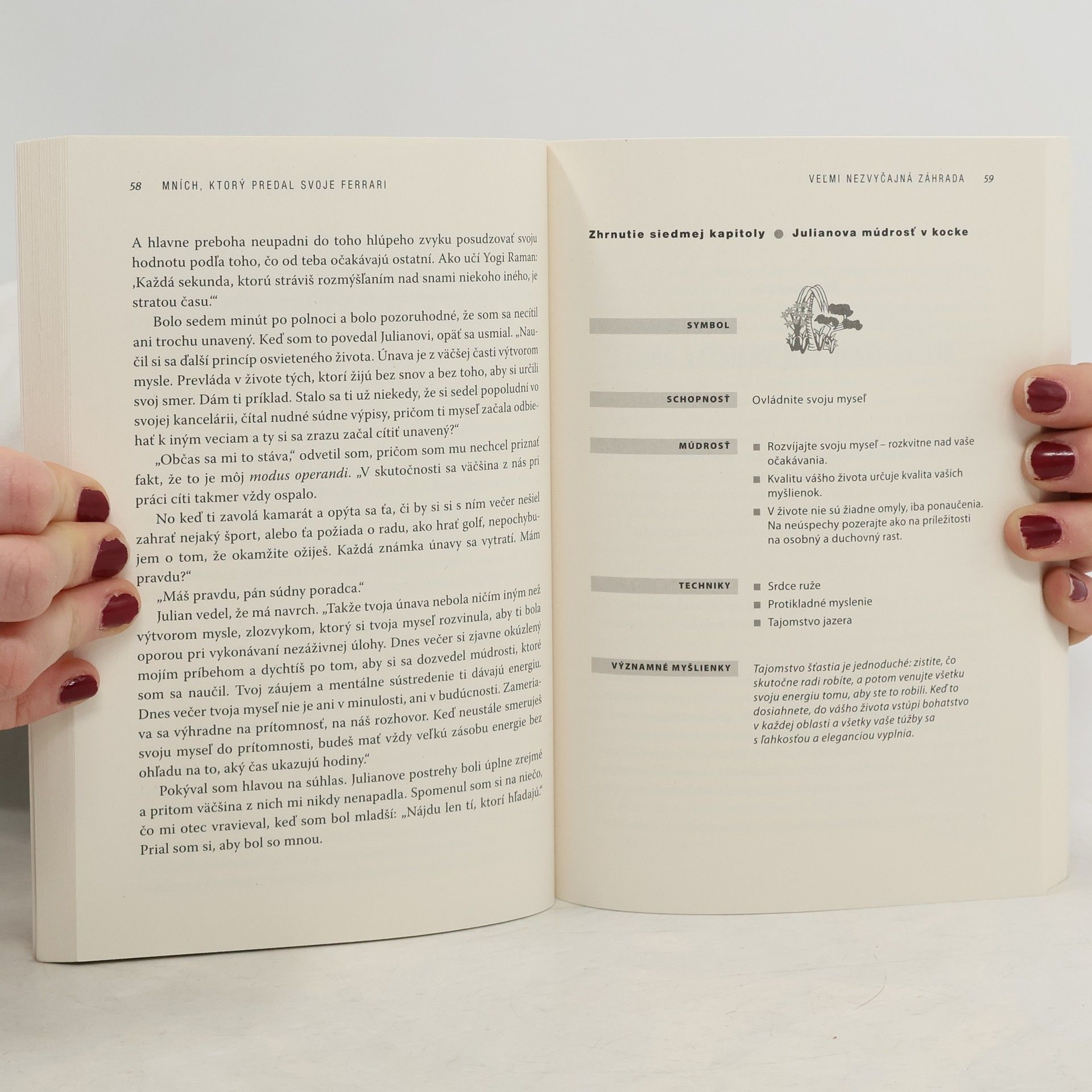 Mních, ktorý predal svoje Ferrari, je kniha, ktorá sa stala fenoménom. Vyšla pred desiatimi rokmi a odvtedy zmenila miliónom ľudí život. Rozpráva príbeh o Julianovi Mantlovi, špičkovom právnikovi, ktorého ohromný materiálny úspech zakrýval prázdnotu v jeho vnútri. Kniha vyšla pôvodne v nízkom náklade, no zakrátko sa z nej stala senzácia. Od tých čias sa jej jednoduché, no mocné posolstvo nádeje, inšpirácie a pravého úspechu rozšírilo po celom svete. Dodnes bola vydaná v 46 jazykoch vo vyše 40 krajinách. Tento medzinárodný bestseller zrozumiteľne a s ľahkosťou odpovedá na najvážnejšie otázky života a tiež ponúka praktické rady, ktoré pomáhajú získať prosperitu, vitálnosť, šťastie a vnútorný pokoj.