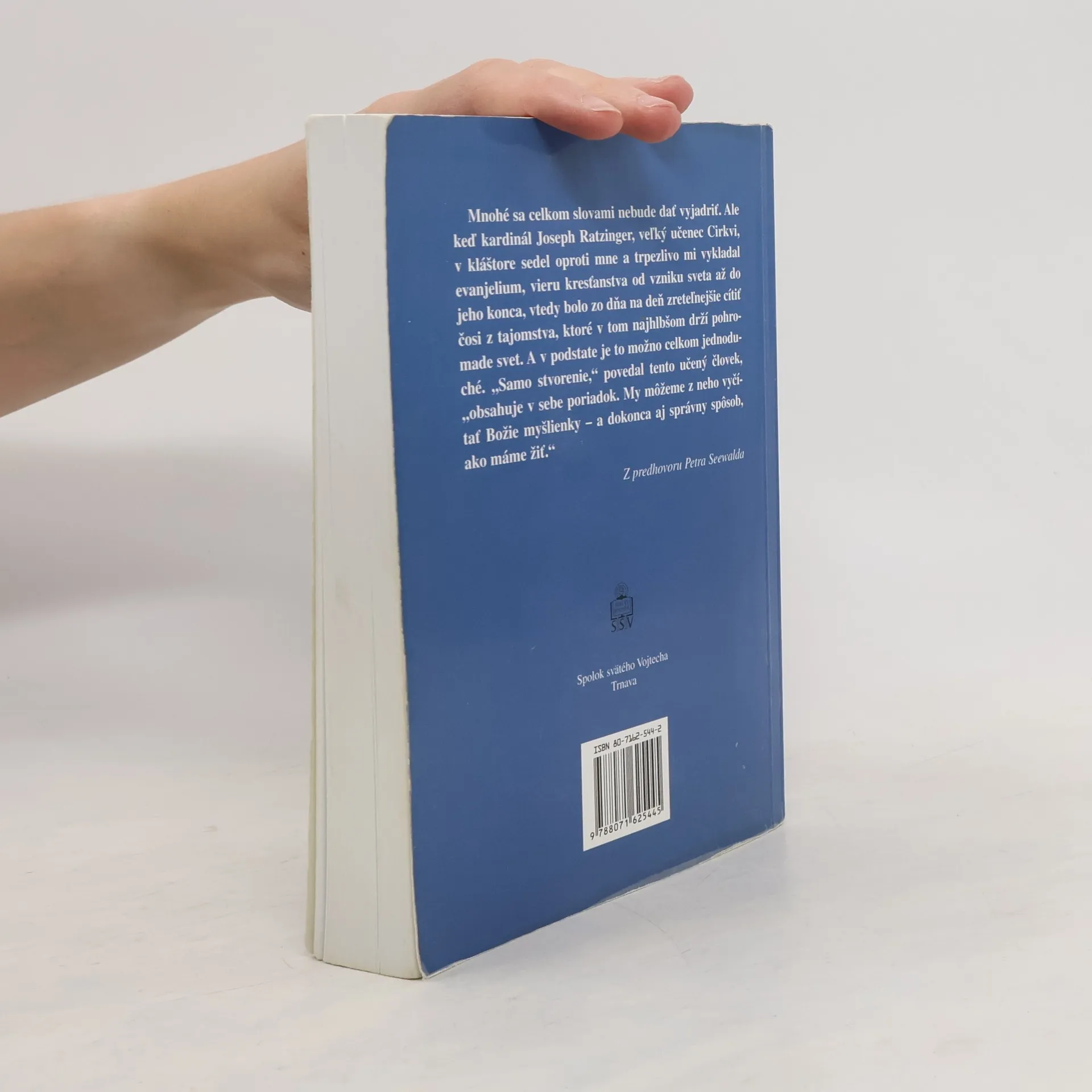 Mnohé sa celkom slovami nebude dať vyjadriť. Ale keď kardinál Joseph Ratzinger, veľký učenec Cirkvi, v kláštore sedel oproti mne a trpezlivo mi vykladal evanjelium, vieru kresťanstva od vzniku sveta až do jeho konca, vtedy bolo zo dňa na deň zreteľnejšie cítiť čosi z tajomstva, ktoré v tom najhlbšom drží pohromade svet. A v podstate je to možno celkom jednoduché. „Samo stvorenie,“ povedal tento učený človek, „obsahuje v sebe poriadok. My môžeme z neho vyčítať Božie myšlienky – a dokonca aj správny spôsob, ako máme žiť.“ Z predhovoru Petra Seewalda Vydanie prvé