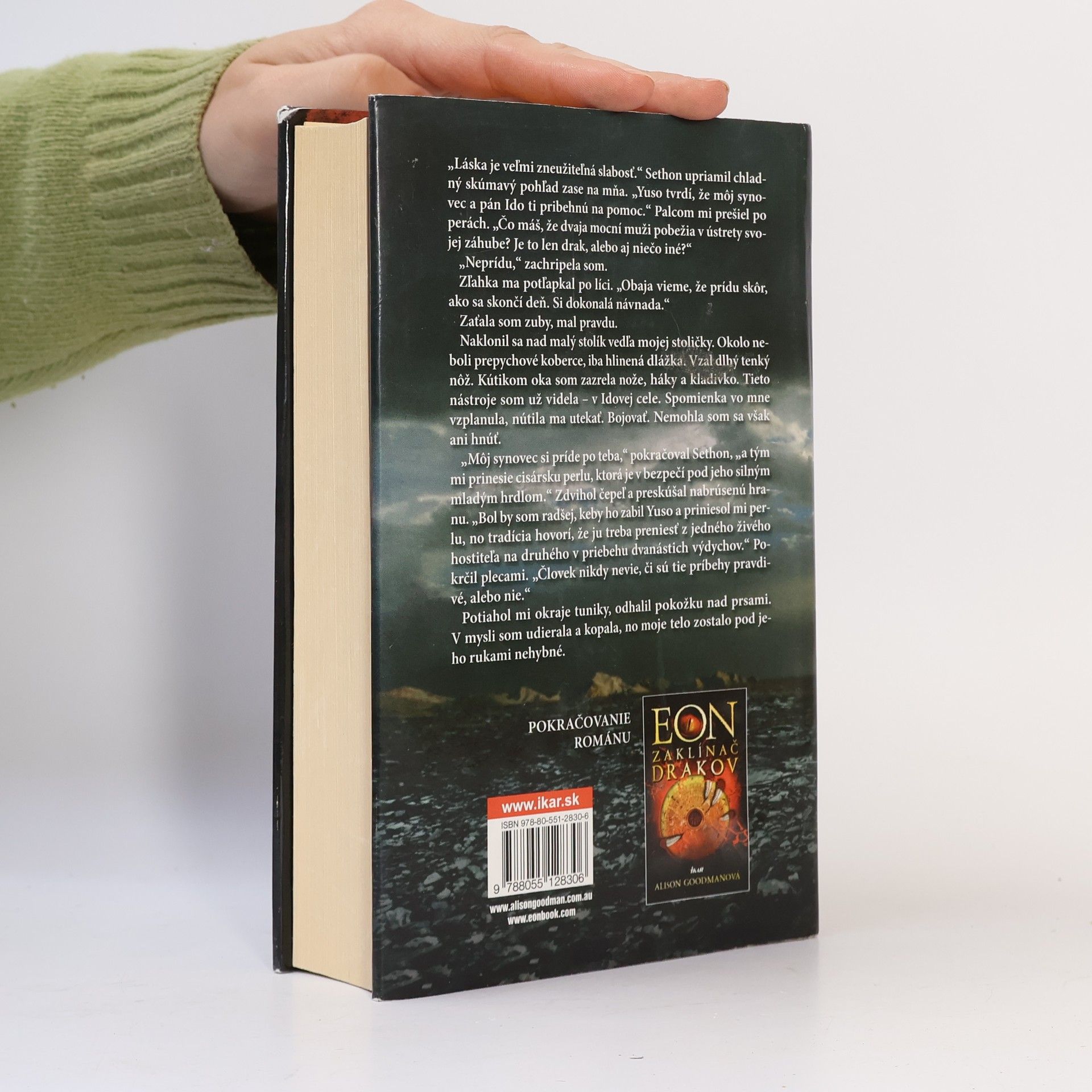 Navštívte Ríšu nebeských drakov! Je to nádherný fantazijný svet inšpirovaný dejinami a kultúrou Číny a Japonska aj modernou súčasnosťou. Práve tu, v Ríši nebeských drakov, žije Eona. Kedysi bola Eonom, dievčaťom prezlečeným za chlapca, a riskovala život, aby sa mohla stať učňom zaklínača drakov a osvojiť si dva druhy umenia – umenie meča a magické schopnosti. Teraz je zaklínačkou Zrkadlového draka a záchrankyňou krajiny, no má ďalšie, oveľa nebezpečnejšie tajomstvo. Nevie ovládať svoju moc. Vždy keď sa pokúsi kontaktovať so Zrkadlovým drakom, stáva sa z nej spojnica pre desať duchovných drakov. Ich zaklínačov zavraždil pán Ido. Cez Eonu prúdi žiaľ osirených drakov a mení jej schopnosti na silu, ktorá ničí krajinu i ľudí. V jej stopách sa blíži ďalšia hrozivá sila! Eona spolu s Rykom a pani Delou totiž utekajú pred armádou ctihodného pána Sethona, ktorý sa svojvoľne vyhlásil za cisára. Utečenci ho chcú zastaviť, ale musia nájsť mladého cisára Kyga a povstalcov z hnutia odporu. Bez Eoninej moci Kygo nemôže získal späť svoj trón... Eona je dráma, pri ktorej sa vám rozbúši srdce, plná vzrušujúcich bojových scén, napätia – a mnohých prekvapení. Zvíťazí v nej boj o moc, alebo láska?