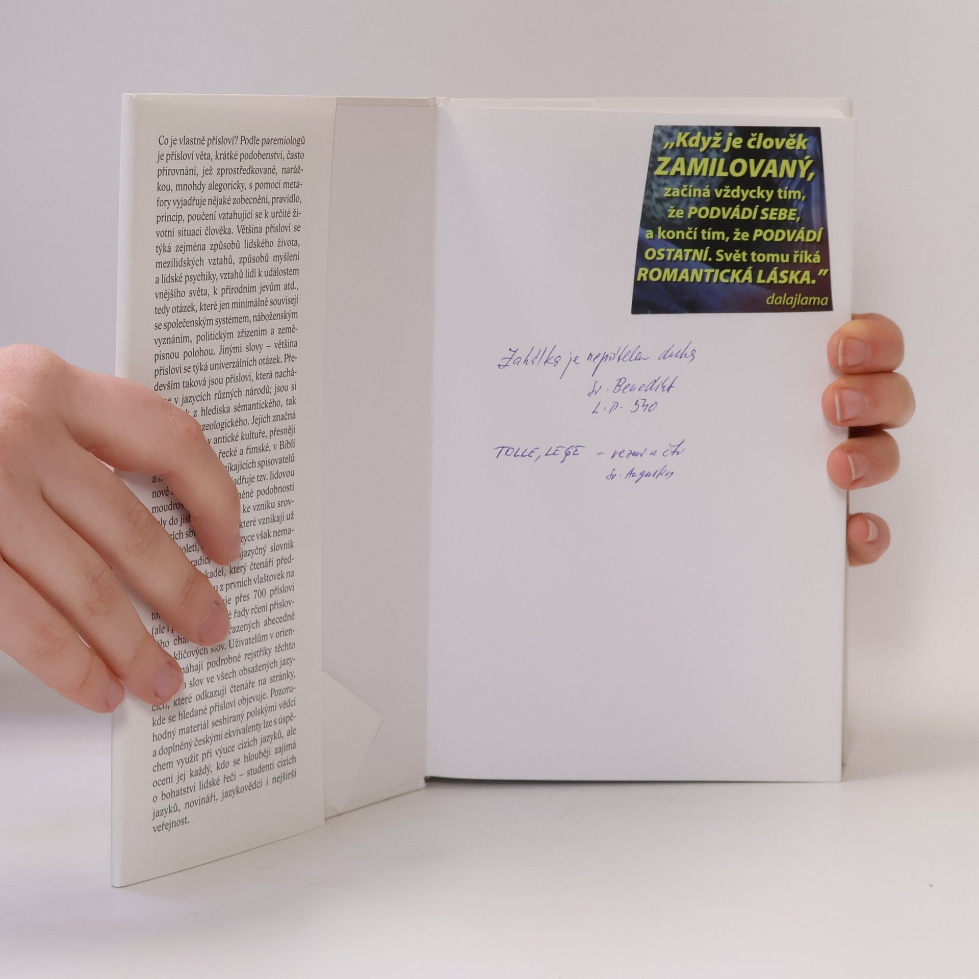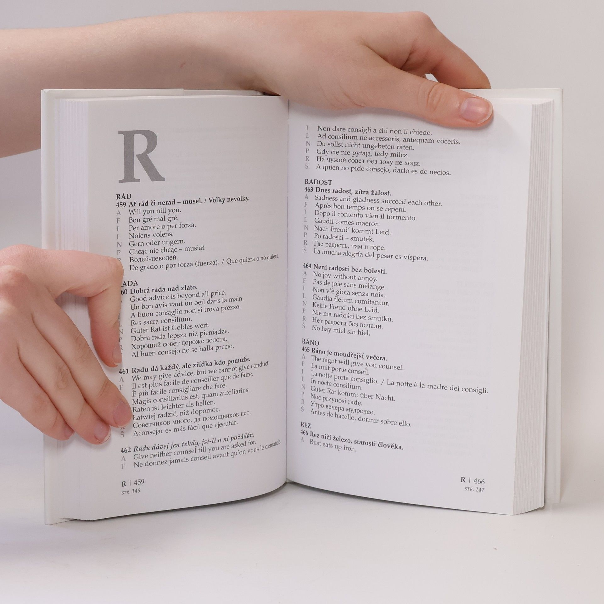 Obsahuje 700 přísloví a pořekadel v češtině, angličtině, francouzštině, italštině, latině, němčině, polštině, ruštině a španělštině.