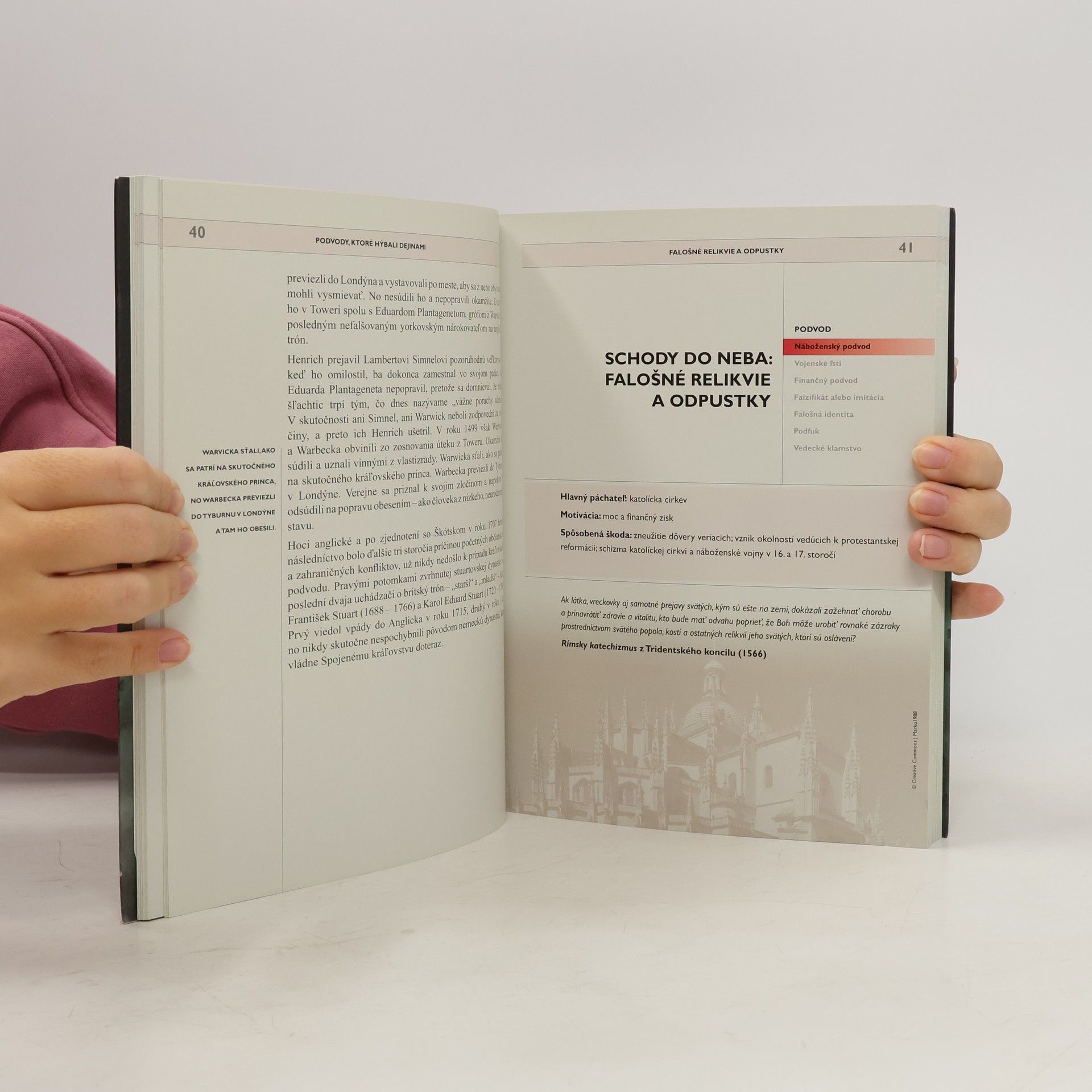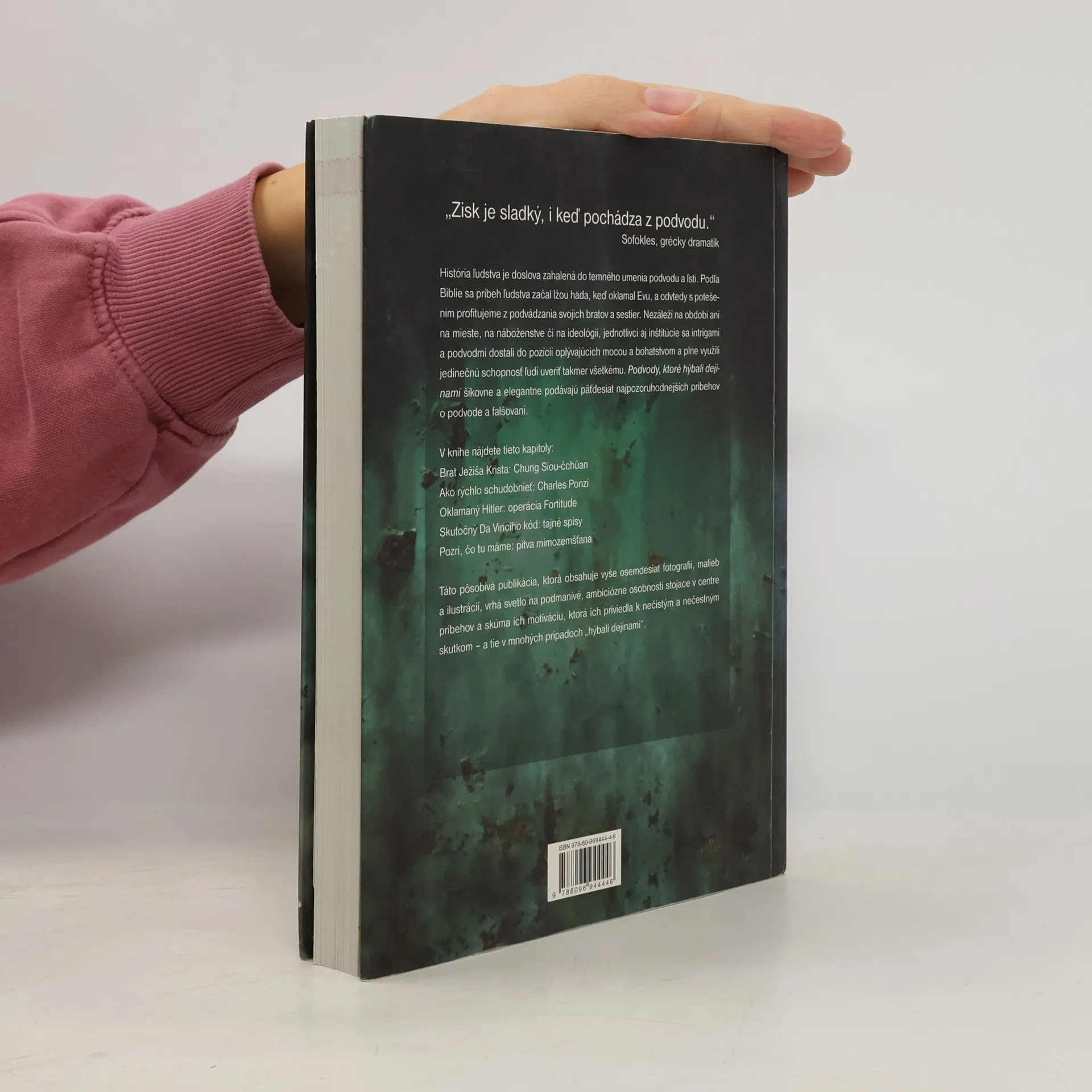 Kniha Podvody, ktoré hýbali dejinami prináša v chronologickom poradí najdôvtipnejšie a najzábavnejšie spôsoby, ako sa ľudia dokázali navzájom okabátiť a podviesť. V pozadí niektorých prípadov stojí finančný motív, ako napríklad v pyramídových hrách Charlesa Ponziho či Bernarda Madoffa. Inokedy vedci zmanipulovali dôkazy v planej nádeji, že dokážu svoje milované teórie; najúspešnejší umelci sfalšovali diela predošlých majstrov, aby zozbierali aspoň omrvinky ich slávy; iní podvodníci hľadali spôsob, ako skryť svoju bezvýznamnosť a nezaujímavý pôvod pod pláštikom požičaného mena. Táto pôsobivá publikácia, ktorá obsahuje vyše osemdesiat fotografií, malieb a ilustrácií, vrhá svetlo na podmanivé, ambiciózne osobnosti stojace v centre príbehov a skúma ich motiváciu, ktorá ich priviedla k nečistým a nečestným skutkom – a tie v mnohých prípadoch „hýbali dejinami“.