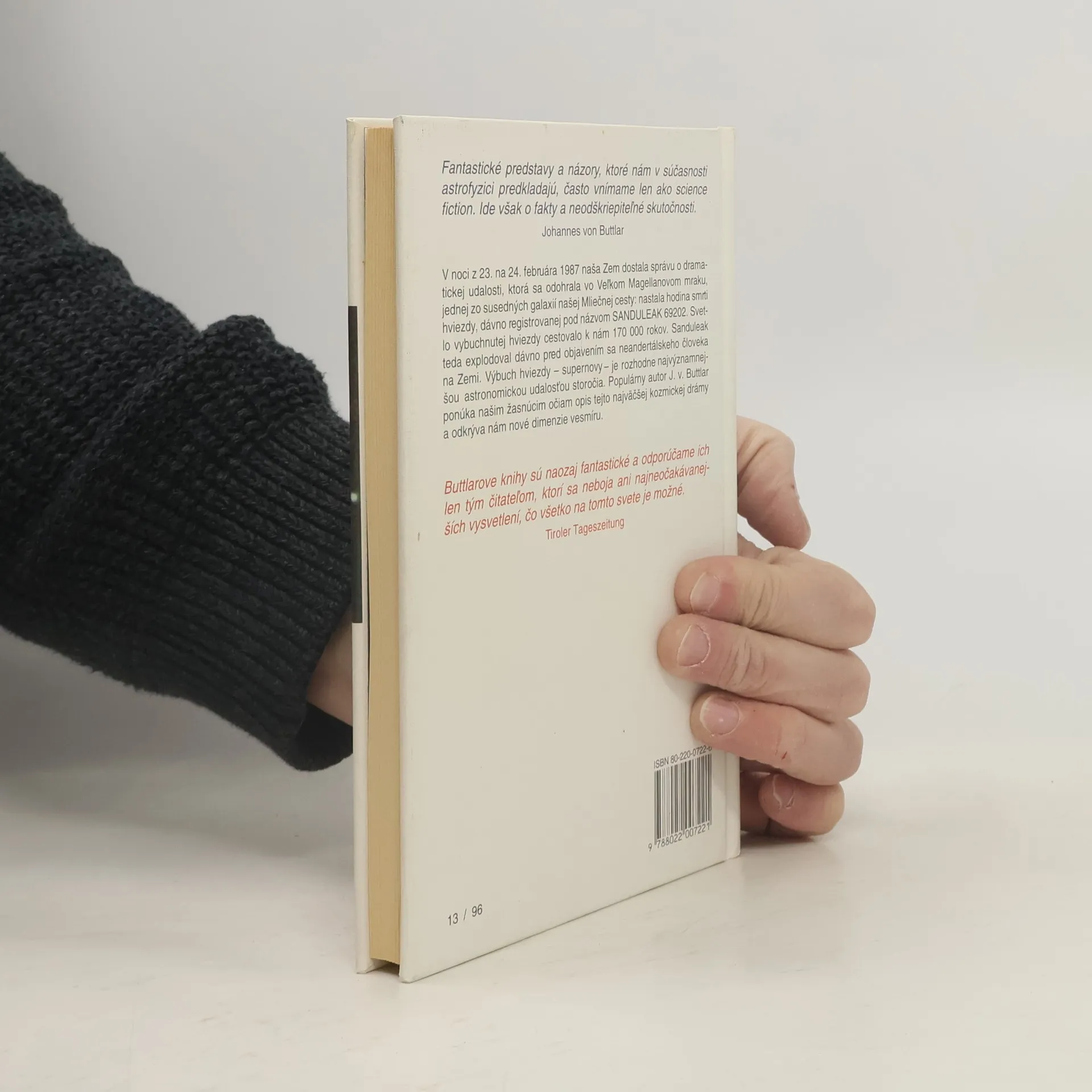 V noci z 23. na 24. februára 1987 naša Zem dostala správu o dramatickej udalosti, ktorá sa odohrala vo Veľkom Magellanovom mraku, jednej zo susedných galaxií našej Mliečnej cesty: nastala hodina smrti hviezdy, dávno registrovanej pod názvom SANDULEAK 69202. Svetlo vybuchnutej hviezdy k nám cestovalo 170 000 rokov. Sanduleak teda explodoval dávno pred objavením sa neandertálskeho človeka na Zemi. Výbuch hviezdy – supernovy – je rozhodne najvýznamnejšou astronomickou udalosťou minulého storočia. Populárny autor J.von Buttlar ponúka našim žasnúcim očiam opis tejto najväčšej kozmickej drámy a odkrýva nám nové dimenzie vesmíru.