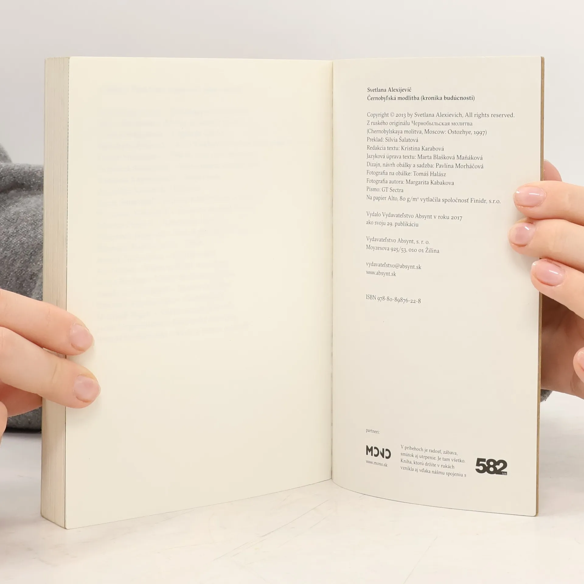 26. apríla 1986 o 1:24 zaznela v černobyľskej jadrovej elektrárni séria výbuchov. Bol to začiatok najväčšej jadrovej nehody v 20. storočí. Černobyľská katastrofa sa stala jednou z najsilnejších tém, ktorú vo svojej tvorbe spracovala laureátka Nobelovej ceny Svetlana Alexijevič. Dvadsať rokov po tejto jadrovej apokalypse sa vracia na miesta, ktoré boli Černobyľom najviac postihnuté, rozpráva sa s ľuďmi, ktorých sa bytostne dotkla a fatálne zasiahla do ich životov. Pozostalí, hasiči, bývalí zamestnanci – každý z nich má vlastný „černobyľský príbeh“. Svetlana Alexijevič svojím nenapodobiteľným spôsobom skladá kroniku nedávnej minulosti, aby tak vytvorila knihu, ktorá je pre nás všetkých varovaním najmä do budúcnosti