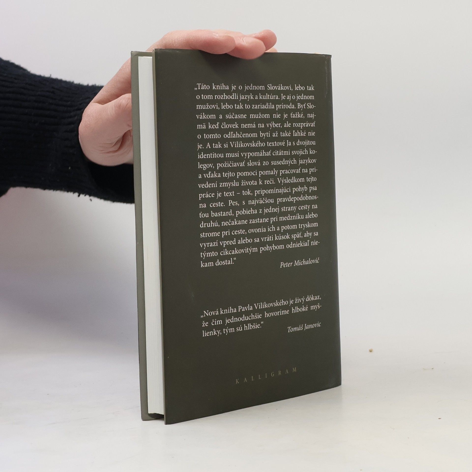„Táto kniha je o jednom Slovákovi, lebo tak o tom rozhodli jazyk a kultúra. Je aj o jednom mužovi, lebo tak to zariadila príroda. Byť Slovákom a súčasne mužom nie je ťažké, najmä keď človek nemá na výber, ale rozprávať o tomto odľahčenom bytí až také ľahké nie je. A tak si Vilikovského textové Ja s dvojitou identitou musí vypomáhať citátmi svojich kolegov, požičiavať slová zo susedných jazykov a vďaka tejto pomoci pomaly pracovať na privedení zmyslu života k reči. Výsledkom tejto práce je text – tok, pripomínajúci pohyb psa na ceste. Pes, s najväčšou pravdepodobnosťou bastard, pobieha z jednej strany cesty na druhú, nečakane zastane pri medzníku alebo strome pri ceste, ovonia ich a potom tryskom vyrazí vpred alebo sa vráti kúsok späť, aby sa týmto cikcakovitým pohybom odniekiaľ niekam dostal.“ Peter Michalovič „Nová kniha Pavla Vilikovského je živý dôkaz, že čím jednoduchšie hovoríme hlboké myšlienky, tým sú hlbšie.“ Tomáš Janovic