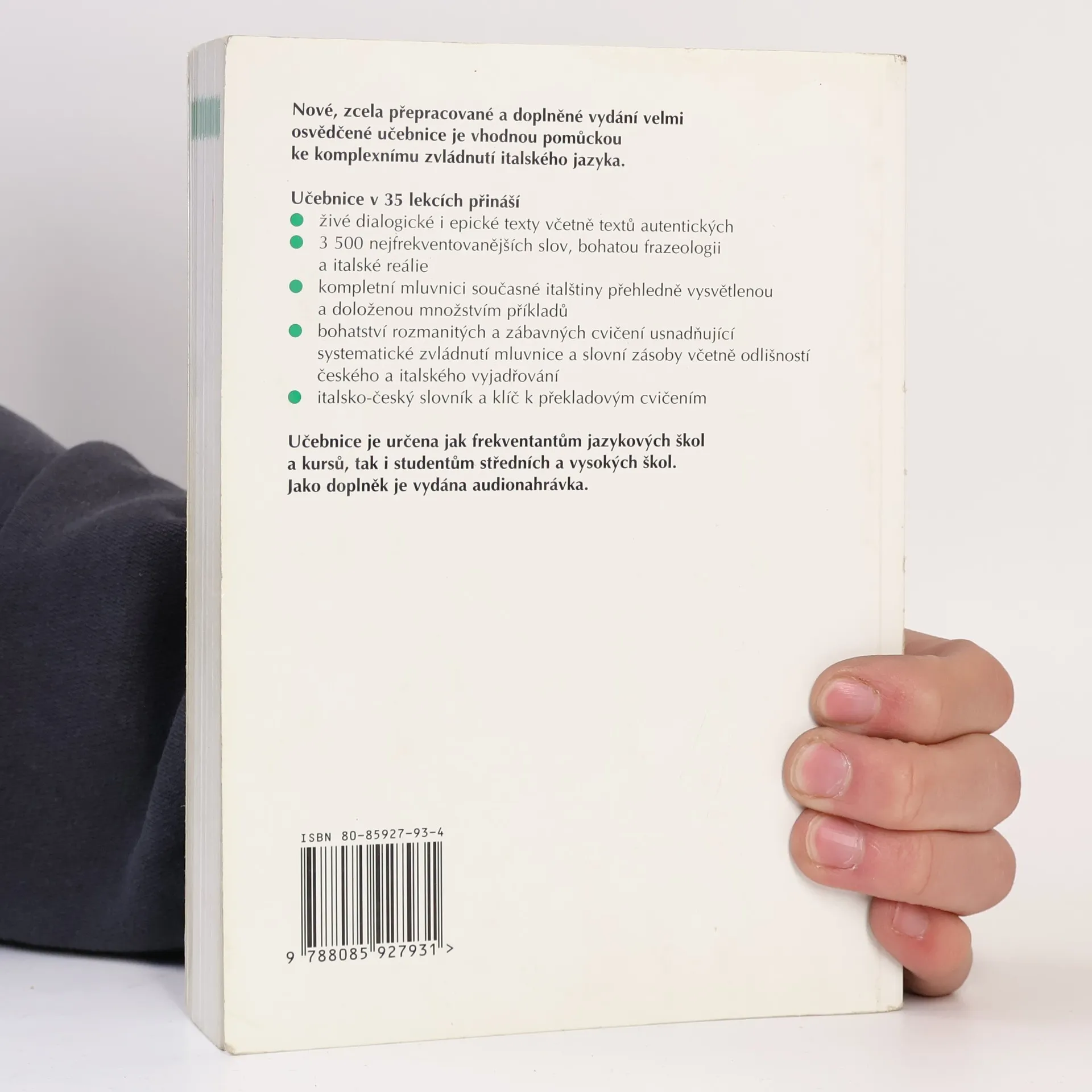 Nejucelenější učebnice italského jazyka na českém knižním trhu ve zcela přepracované a doplněné podobě obsahuje kompletní mluvnici současné italštiny, přibližně 3500 nejfrekventovanějších slov a bohatou frazeologii. Autorky, které mají bohaté pedagogické zkušenosti z výuky italštiny na středních, vysokých i jazykových školách, vysvětlují jednotlivé mluvnické jevy přehledně a srozumitelně, dokládají je množstvím příkladů a nabízejí jejich procvičení v celé řadě rozmanitých a zábavných cvičení. Další cvičení usnadňují zvládnutí slovní zásoby a nácvik komunikativních schopností. Uživatele bezesporu zaujmou i texty zařazené do učebnice zprostředkovávající italské reálie různými formami a četné autentické materiály. Učebnice je určena studentům a pedagogům středních, vysokých a jazykových škol či kursů. Klíč a audionahrávka k učebnici však umožňuje studium rovněž samoukům.