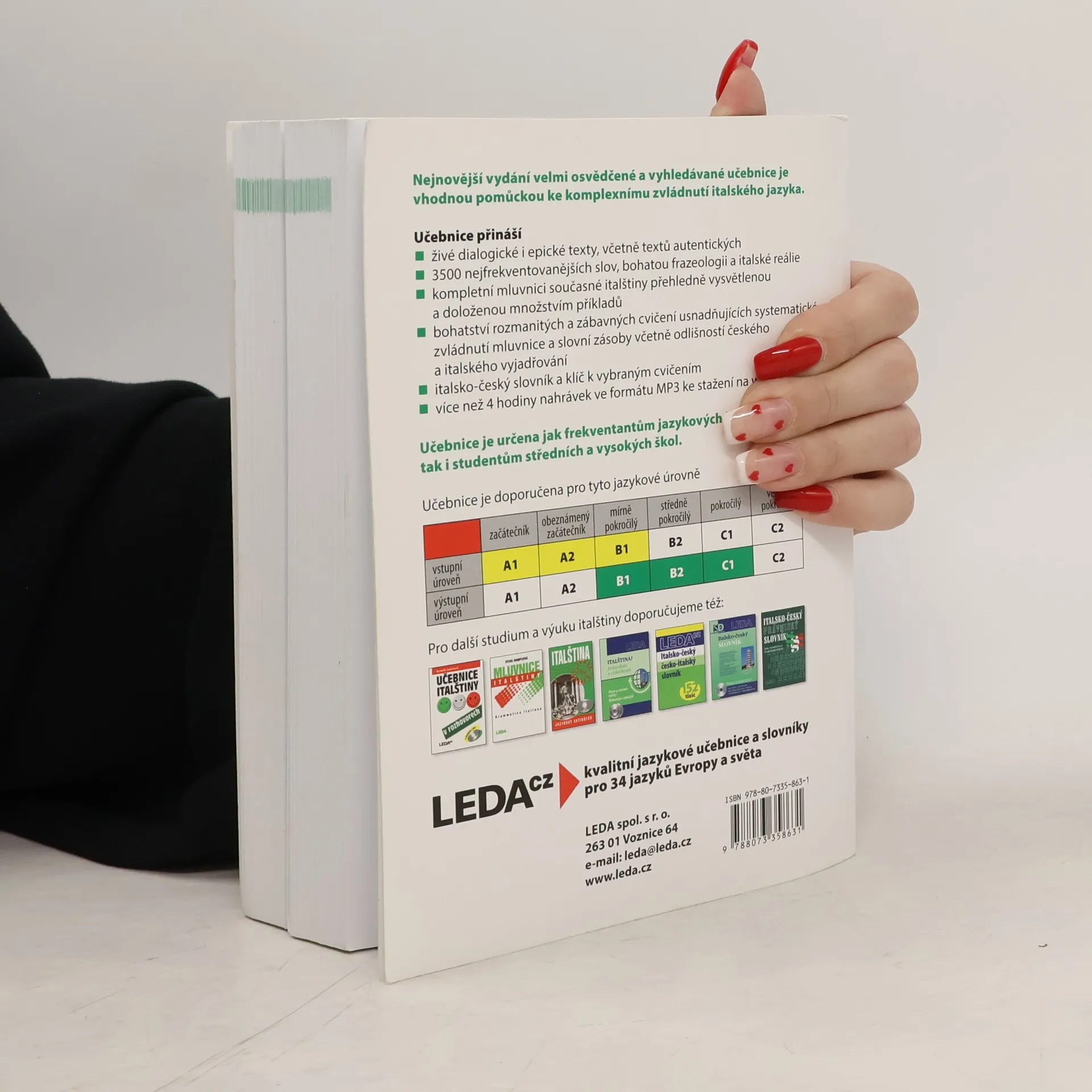 Nejucelenější učebnice italského jazyka na českém knižním trhu ve zcela přepracované a doplněné podobě obsahuje kompletní mluvnici současné italštiny, přibližně 3500 nejfrekventovanějších slov a bohatou frazeologii. Autorky, které mají bohaté pedagogické zkušenosti z výuky italštinyna středních, vysokých i jazykových školách, vysvětlují jednotlivé mluvnické jevy přehledně a srozumitelně, dokládají je množstvím příkladů a nabízejí jejich procvičení v celé řadě rozmanitých a zábavných cvičení. Další cvičení usnadňují zvládnutí slovní zásoby a nácvik komunikativních schopností. Uživatele bezesporu zaujmou i texty zařazené do učebnice zprostředkovávající italské reálie různými formami a četné autentické materiály. Učebnice je určena studentům a pedagogům středních, vysokých a jazykových škol či kursů. Klíč a nahrávka s MP3 soubory však umožňují studium rovněž samoukům. Nahrávka je k dispozici ke stažení na této stránce.