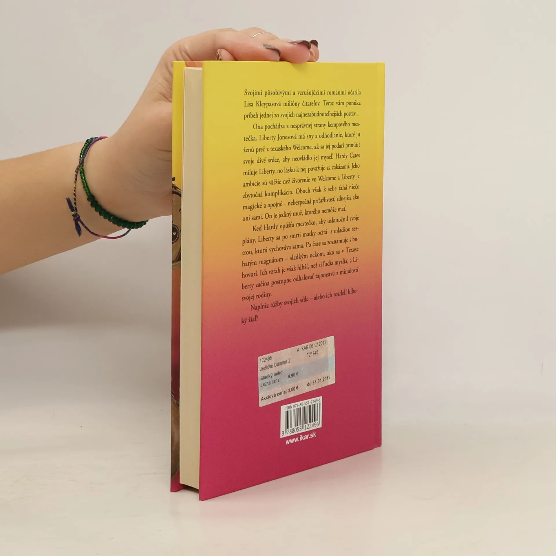 Svojimi pôsobivými a vzrušujúcimi románmi očarila Lisa Kleypasová milióny čitateľov. Teraz vám ponúka príbeh jednej zo svojich najnezabudnuteľnejších postáv... Ona pochádza z nesprávnej strany kempového mestečka. Liberty Jonesová má sny a odhodlanie, ktoré ju ženú preč z texaského Welcome, ak sa jej podarí prinútiť svoje divé srdce, aby neovládlo jej myseľ. Hardy Cates miluje Liberty, no lásku k nej považuje za zakázanú. Jeho ambície sú väčšie než živorenie vo Welcome a Liberty je zbytočná komplikácia. Oboch však k sebe ťahá niečo magické a opojné – nebezpečná príťažlivosť, silnejšia ako oni sami. On je jediný muž, ktorého nemôže mať. Keď Hardy opúšťa mestečko, aby uskutočnil svoje plány, Liberty sa po smrti matky ocitá s mladšou sestrou, ktorú vychováva sama. Po čase sa zoznamuje s bohatým magnátom – sladkým oteckom, ako sa v Texase hovorí. Ich vzťah je však hlbší, než si ľudia myslia, a Liberty začína postupne odhaľovať tajomstvá z minulosti svojej rodiny. Naplnia túžby svojich sŕdc – alebo ich rozdelí hlboký žiaľ?