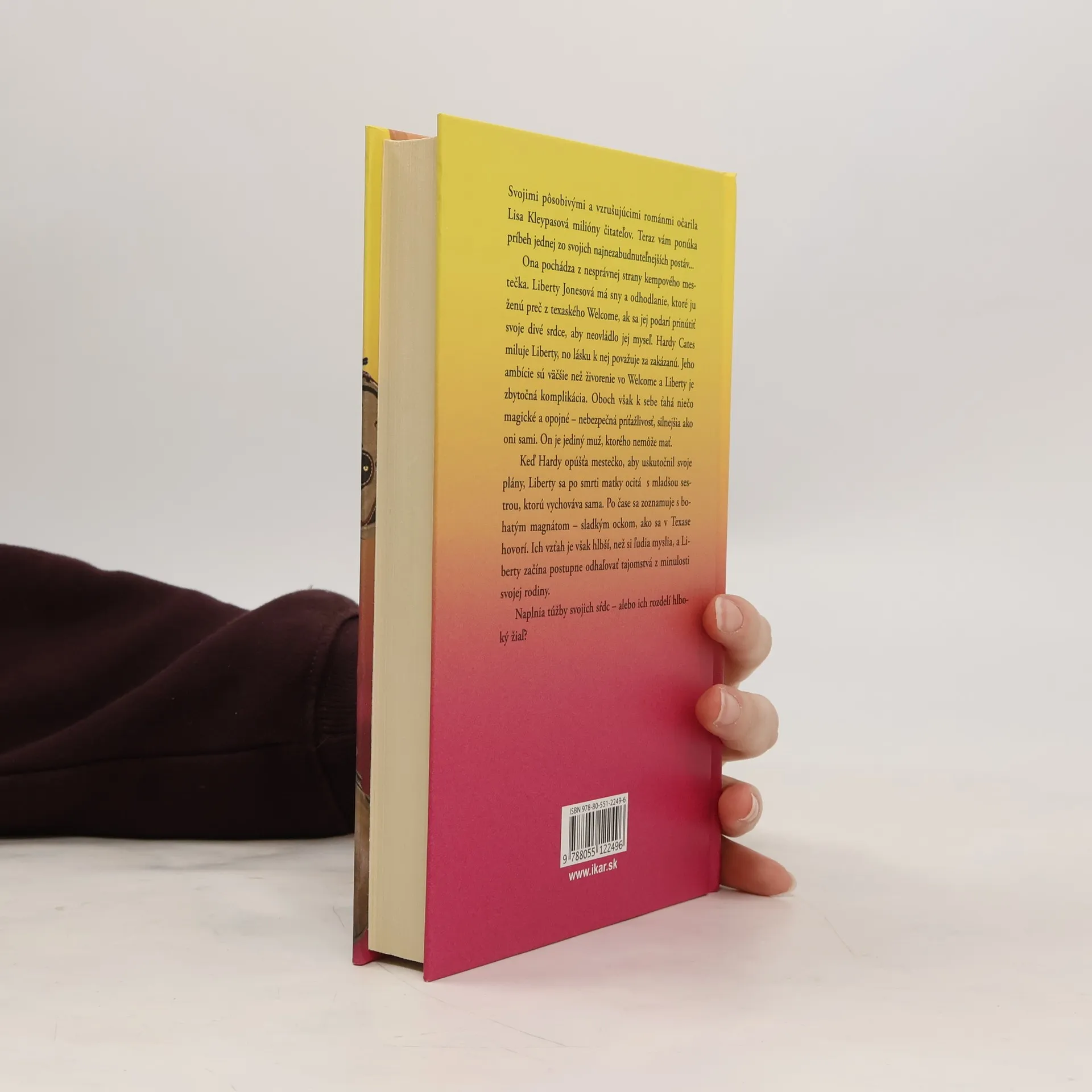 Svojimi pôsobivými a vzrušujúcimi románmi očarila Lisa Kleypasová milióny čitateľov. Teraz vám ponúka príbeh jednej zo svojich najnezabudnuteľnejších postáv... Ona pochádza z nesprávnej strany kempového mestečka. Liberty Jonesová má sny a odhodlanie, ktoré ju ženú preč z texaského Welcome, ak sa jej podarí prinútiť svoje divé srdce, aby neovládlo jej myseľ. Hardy Cates miluje Liberty, no lásku k nej považuje za zakázanú. Jeho ambície sú väčšie než živorenie vo Welcome a Liberty je zbytočná komplikácia. Oboch však k sebe ťahá niečo magické a opojné – nebezpečná príťažlivosť, silnejšia ako oni sami. On je jediný muž, ktorého nemôže mať. Keď Hardy opúšťa mestečko, aby uskutočnil svoje plány, Liberty sa po smrti matky ocitá s mladšou sestrou, ktorú vychováva sama. Po čase sa zoznamuje s bohatým magnátom – sladkým oteckom, ako sa v Texase hovorí. Ich vzťah je však hlbší, než si ľudia myslia, a Liberty začína postupne odhaľovať tajomstvá z minulosti svojej rodiny. Naplnia túžby svojich sŕdc – alebo ich rozdelí hlboký žiaľ?