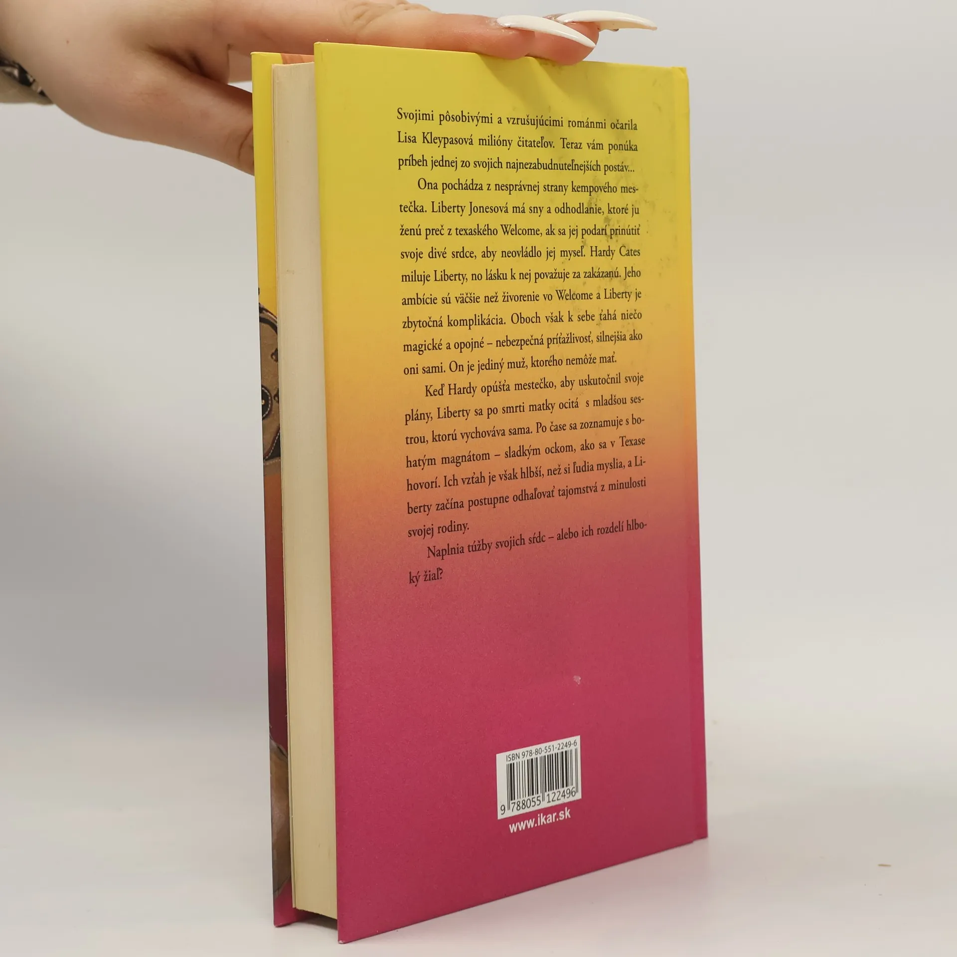Svojimi pôsobivými a vzrušujúcimi románmi očarila Lisa Kleypasová milióny čitateľov. Teraz vám ponúka príbeh jednej zo svojich najnezabudnuteľnejších postáv... Ona pochádza z nesprávnej strany kempového mestečka. Liberty Jonesová má sny a odhodlanie, ktoré ju ženú preč z texaského Welcome, ak sa jej podarí prinútiť svoje divé srdce, aby neovládlo jej myseľ. Hardy Cates miluje Liberty, no lásku k nej považuje za zakázanú. Jeho ambície sú väčšie než živorenie vo Welcome a Liberty je zbytočná komplikácia. Oboch však k sebe ťahá niečo magické a opojné – nebezpečná príťažlivosť, silnejšia ako oni sami. On je jediný muž, ktorého nemôže mať. Keď Hardy opúšťa mestečko, aby uskutočnil svoje plány, Liberty sa po smrti matky ocitá s mladšou sestrou, ktorú vychováva sama. Po čase sa zoznamuje s bohatým magnátom – sladkým oteckom, ako sa v Texase hovorí. Ich vzťah je však hlbší, než si ľudia myslia, a Liberty začína postupne odhaľovať tajomstvá z minulosti svojej rodiny. Naplnia túžby svojich sŕdc – alebo ich rozdelí hlboký žiaľ?