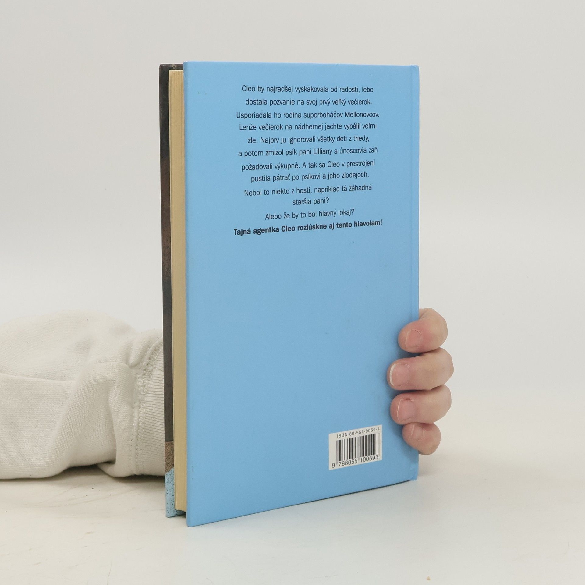 Cleo by najradšej vyskakovala od radosti, lebo dostala pozanie na svoj prvý veľký večierok. Usporiadala ho rodina superboháčov Mellonovcov. Lenže večierok na nádhernej jachte vypálil veľmi zle. Najprv ju ignorovali všetky deti z triedy, a potom zmizol psík pani Lilliany a únoscovia zaň požadovali výkupné. A tak sa Cleo v prestrojení pustila pátrať po psíkovi a jeho zlodejoch. Nebol to niekto z hostí, napríklad tá záhadná staršia pani? Alebo že by to bol hlavný lokaj? Tajná agentka Cleo rozlúskne aj tento hlavolam!