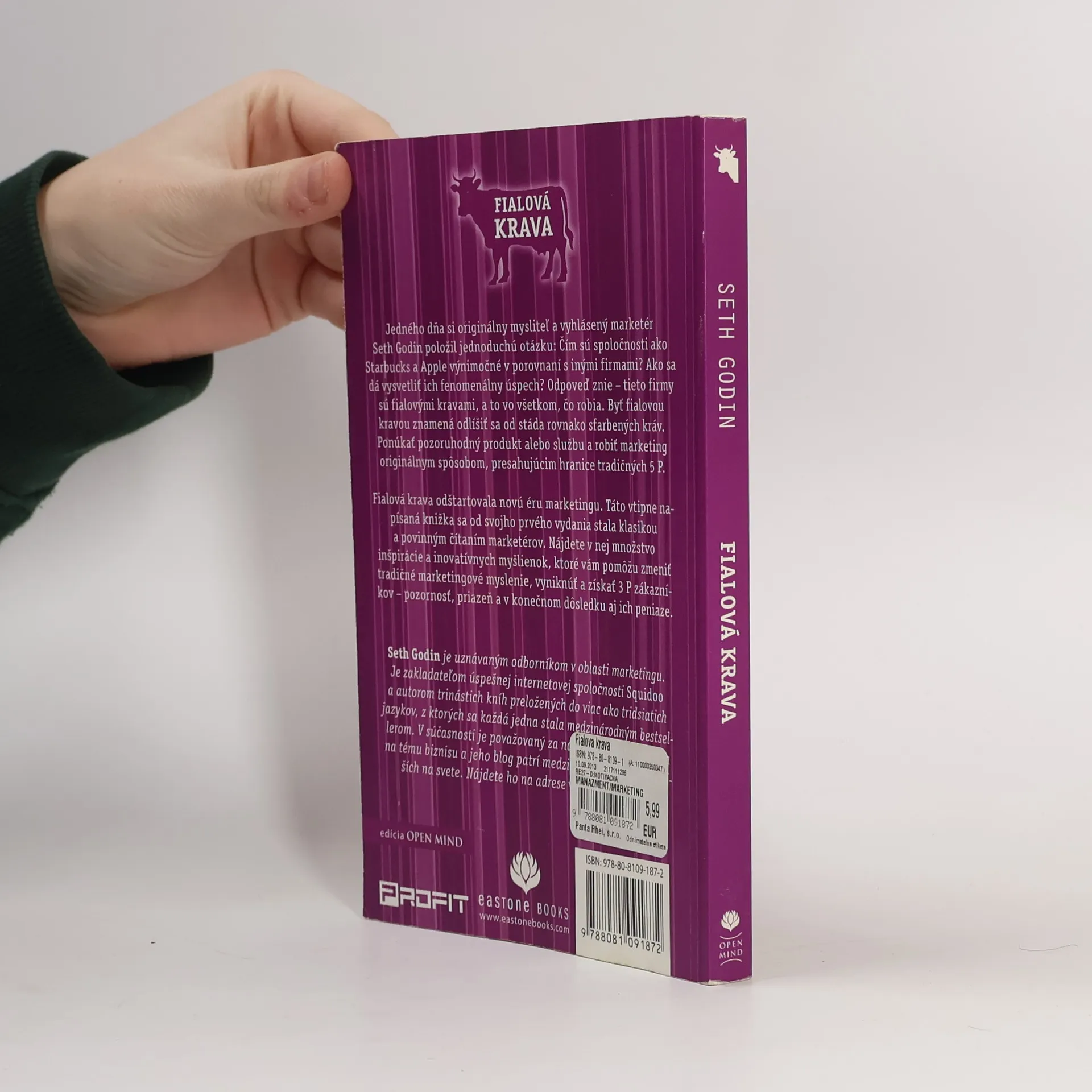 Chcete mať úspech v podnikaní, ale reklamy na vaše produkty už neprinášajú očakávaný efekt? Staňte sa fialovou kravou a odlíšte sa od stáda rovnako sfarbených, nudných kráv! Ponúknite pozoruhodný produkt alebo službu a začnite robiť marketing originálnym spôsobom, presahujúcim hranice tradičných 5 P. V knihe Fialová krava nájdete množstvo inšpirácie a inovatívnych myšlienok, ktoré vám pomôžu zmeniť tradičné marketingové myslenie, vyniknúť a získať 3 P zákazníkov – pozornosť, priazeň a v konečnom dôsledku aj ich peniaze. Autor Seth Godin je uznávaným odborníkom v oblasti marketingu a autorom trinástich kníh, z ktorých sa každá jedna stala medzinárodným bestsellerom. V súčasnosti je považovaný za najvplyvnejšieho blogera na tému biznisu a jeho blog patrí medzi dvadsaťpäť najčítanejších na svete.