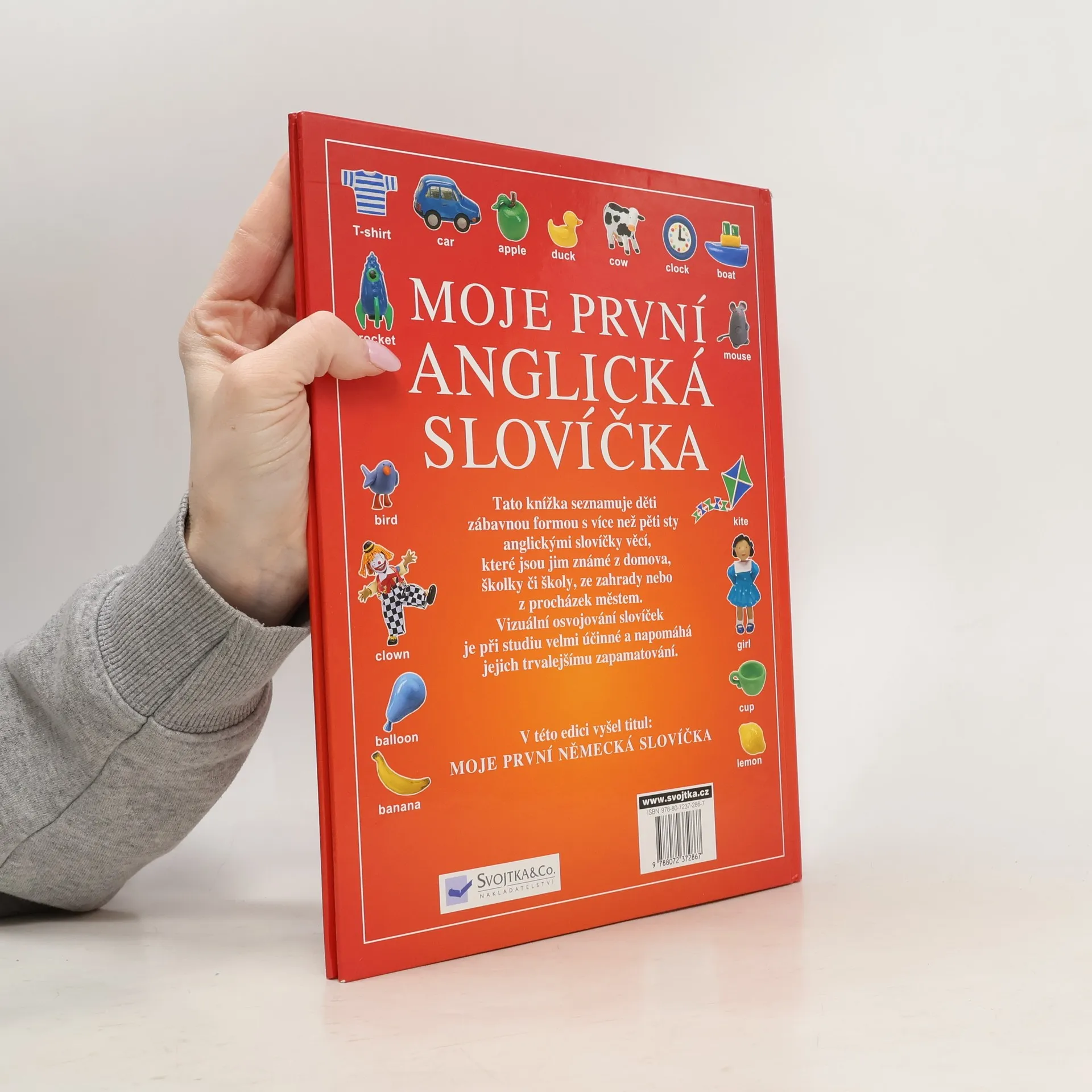 Tato knížka - Moje první anglická slovíčka - plná půvabných obrázků seznamuje děti zábavnou formou s více než pěti sty anglickými slovíčky – názvy věcí, které znají z domova, školky či školy, ze zahrady nebo z procházek městem. Vizuální osvojování slovíček je při učení velmi účinné a napomáhá k jejich trvalejšímu zapamatování. Barevné obrázky jsou velmi názorné a jsou přizpůsobeny dětskému vnímání. V závěru knihy najdete abecedně řazený slovníček, který obsahuje všechna anglická slovíčka, se kterými se čtenář na obrázcích v této knize setká. Vedle každého slovíčka je uvedena anglická výslovnost s českým překladem. Kniha je koncipována tak, aby ji mohli využít jak ti nejmenší, tak předškoláci nebo malí školáci. Tato milá knížka poskytne dětem mnoho chvil příjemné zábavy a nenásilného učení.