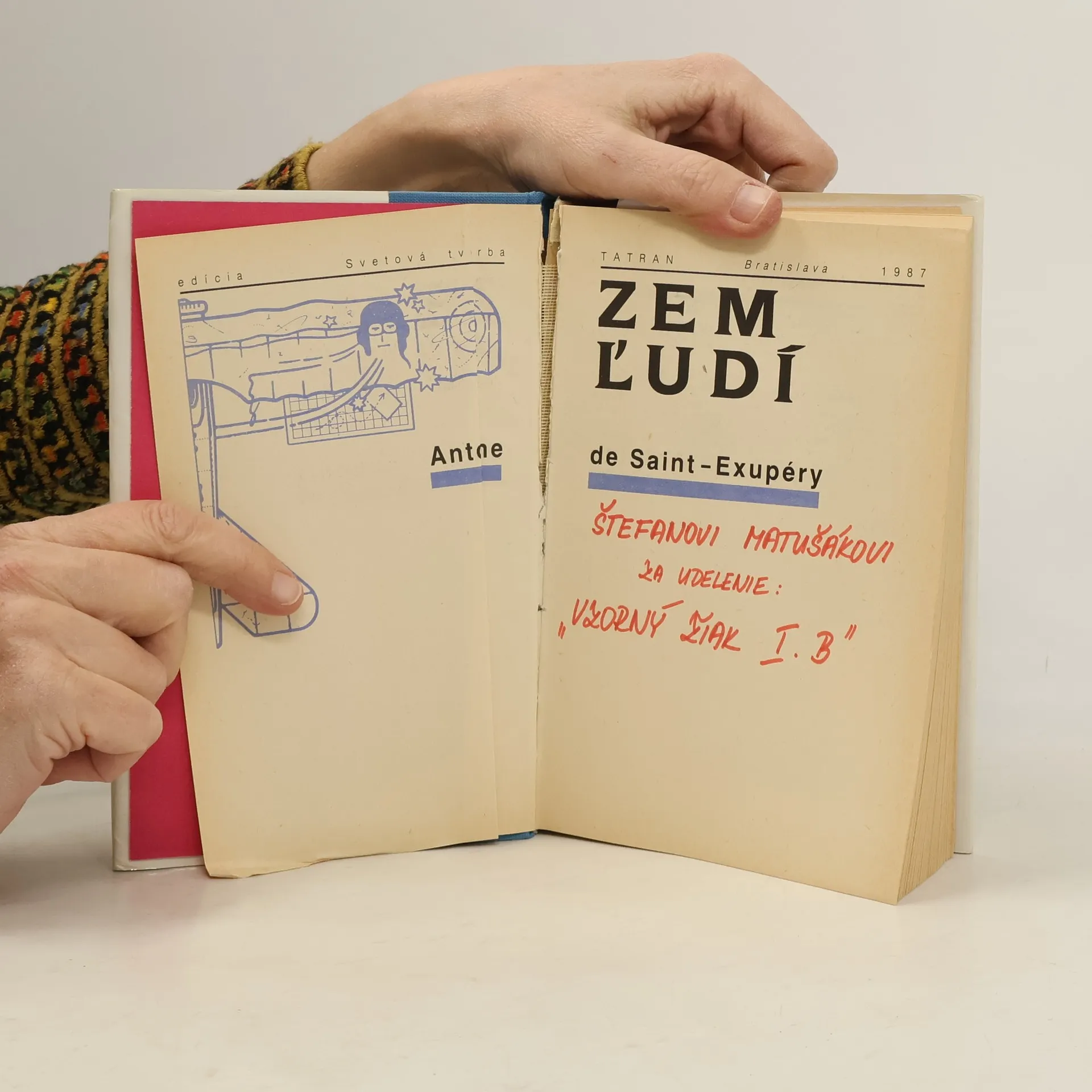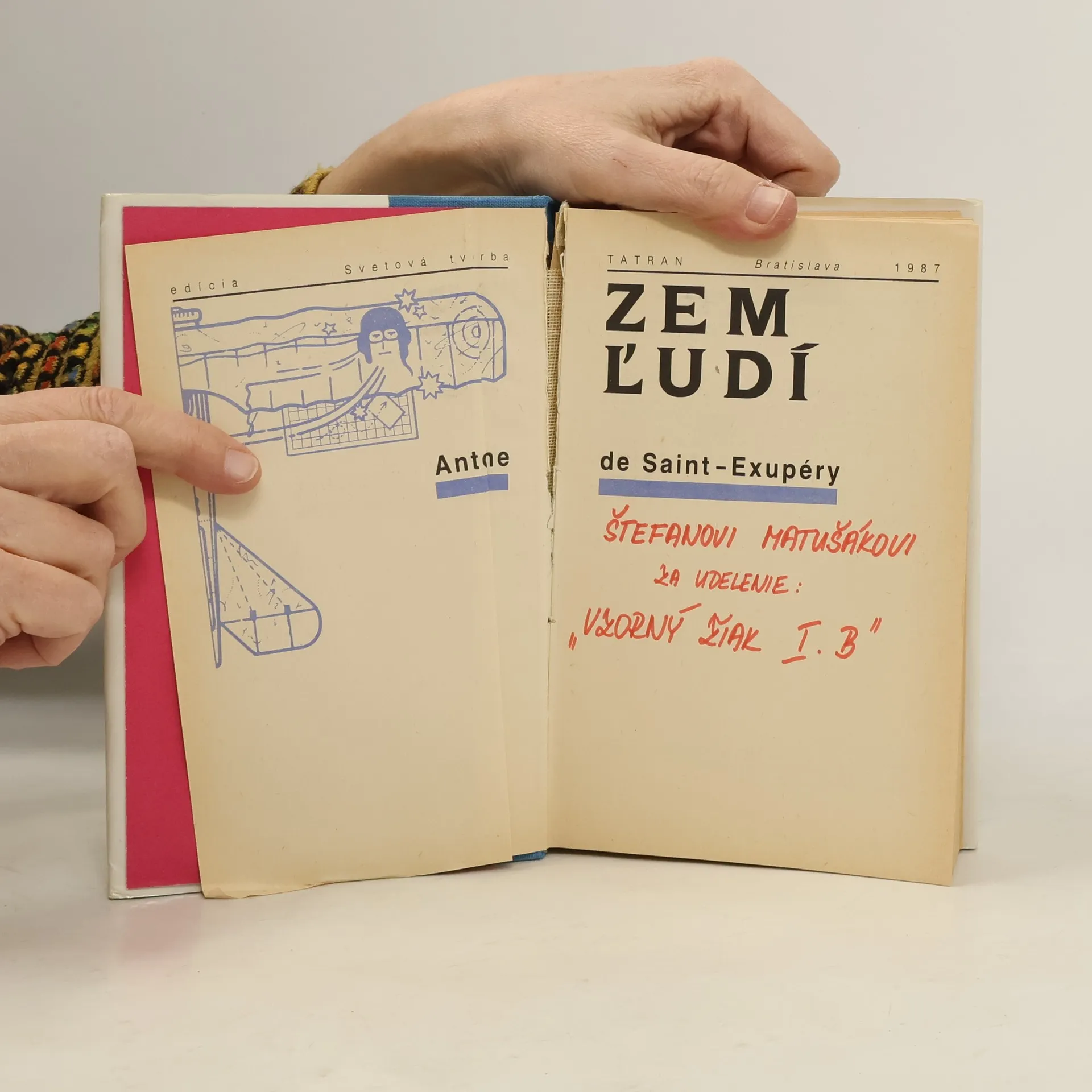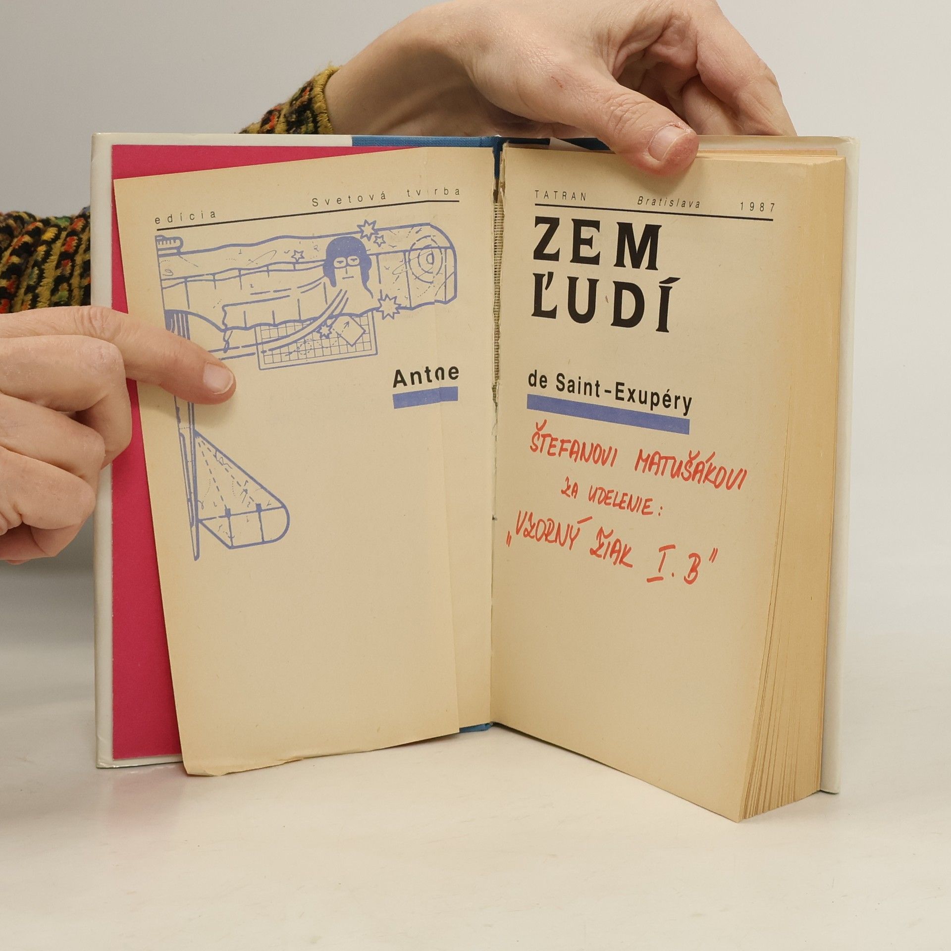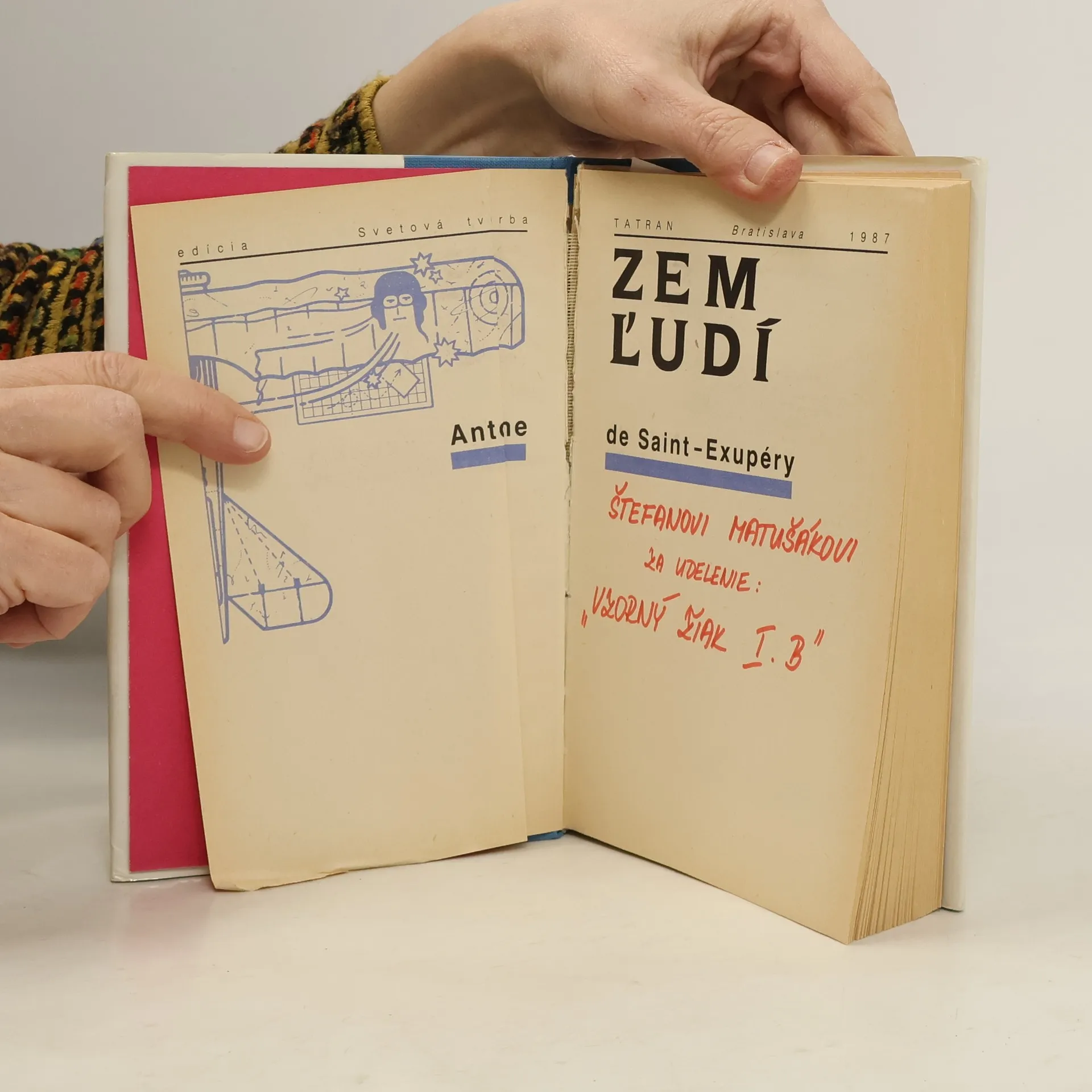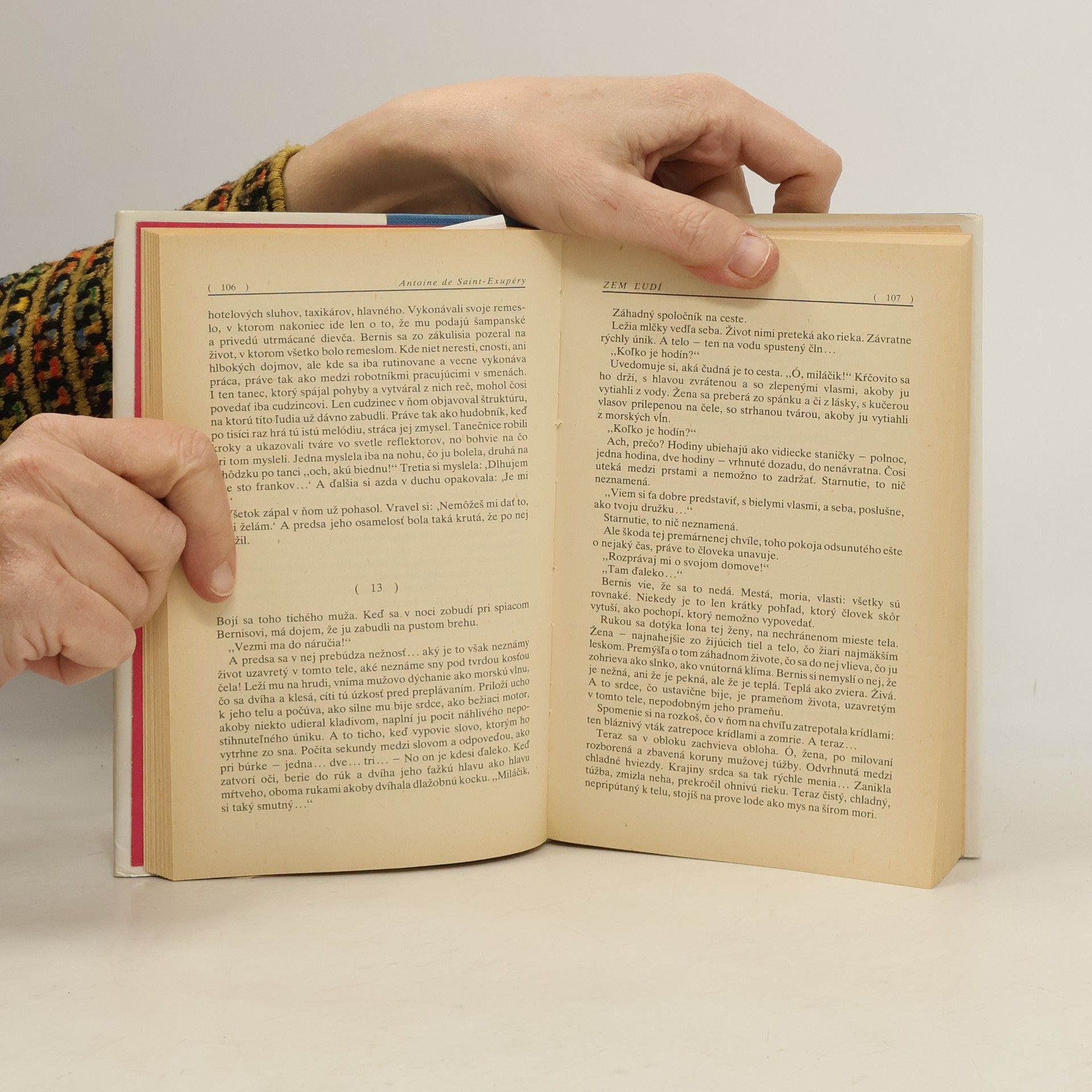 Kniha Zem ľudí nesie názov podľa jedného z diel, ktoré obsahuje. Zem ľudí čerpá skúsenosti civilného letca. Kniha je komponovaná spôsobom, ktorý je pre autora príznačný: je to zmes úvah, meditácií a príbehov zo života letcov. Lietadlo nie je cieľ, ale prostriedok. Človek neobetuje život kvôli lietadlu. Sedliak tiež neorie preto, že má pluh, hovorí na jednom mieste a tieto slová obsahujú základ autorovej životnej filozofie. Letci nie sú hazardérmi, nenasadzujú svoje životy len z túžby po dobrodružstve a pre vzrušenie z rizika: to by bola len mladícka nerozvážnosť. Nový rozmer ich odvahe dáva pocit zodpovednosti za seba, za kamarátov, za úlohu, ktorú každý z nich prijal ako dôsledok svojej vlastnej slobodnej voľby. okrem toho je v knihe aj Malý princ, Pošta na juh, Nočný let, Vojnový pilot, List rukojemníkovi, List generálovi X. V závere je doslov Ján Števčeka.