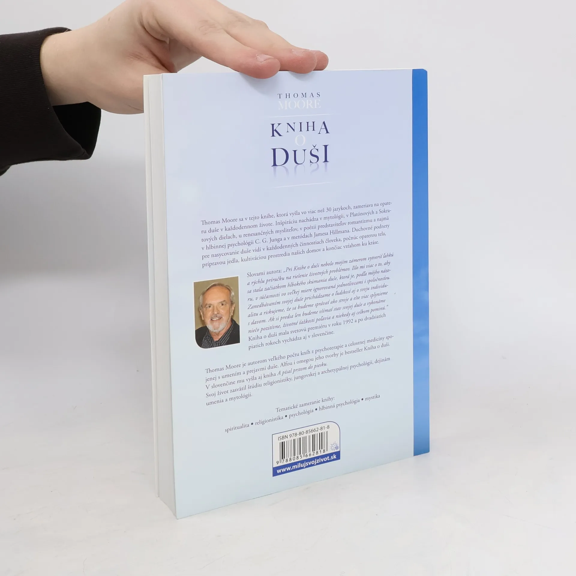 Thomas Moore sa v tejto úspešnej knihe, ktorá vyšla vo viac než 30 jazykoch, zameriava na opateru duše v každodennom živote. Ak chceme dosiahnuť v živote naplnenie a spokojnosť, nemôžeme obchádzať podnety našej duše. Autor nachádza inšpiráciu v mytológii, v Platónových a Sokratových dielach, u renesančných mysliteľov, v poézii predstaviteľov romantizmu a najmä v hlbinnej psychológii C. G. Junga a v metódach Jamesa Hillmana. Duchovné podnety pre nasycovanie duše vidí v každodenných činnostiach človeka, počnúc opaterou tela, prípravou jedla, kultiváciou prostredia našich domov a končiac vzťahom ku kráse.Slovami autora: "Pri Knihe o duši nebolo mojím zámerom vytvoriť ľahkú a rýchlu príručku na riešenie životných problémov. Išlo mi viac o to, aby sa stala začiatkom hlbokého skúmania duše, ktorá je, podľa môjho názoru, v súčasnosti vo veľkej miere ignorovaná jednotlivcami i spoločnosťou. Zanedbávaním svojej duše prichádzame o ľudskosť aj o svoju individualitu a riskujeme, že sa budeme správať ako stroje a ešte viac splynieme s davom. Ak si predsa len budeme všímať stav svojej duše a vykonáme niečo pozitívne, životné ťažkosti poľavia a niekedy aj celkom pominú."