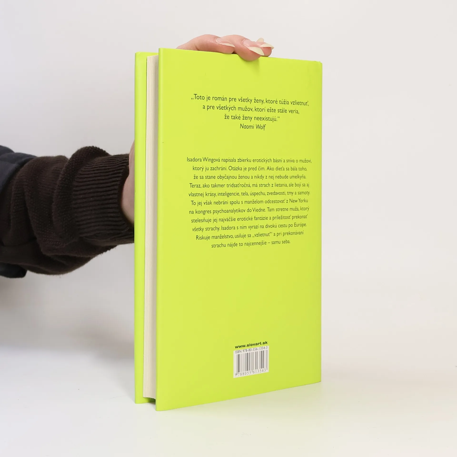 Úspešná americká spisovateľka Erica Jong sa preslávila románom Strach z lietania, ktorý vyšiel v roku 1973. Krátko po vydaní si vyslúžil hodnotenia kontroverzný a revolučný, najmä za Jongovej otvorený prístup k ženskej sexualite. Kniha je dnes považovaná za nadčasový príbeh o sebaobjavovaní a slobode. Inteligentná a nekonvenčná spisovateľka Isadora Wingová hľadá muža, ktorého by mohla naozaj milovať a s ktorým by bola šťastná. S manželom prichádza do Viedne na kongres psychoanalytikov. Zaľúbi sa do jedného z kolegov a neskôr spolu cestujú po Európe. Román humorným spôsobom glosuje módny psychoanalytický ošiaľ v Amerike 70. rokov dvadsiateho storočia.