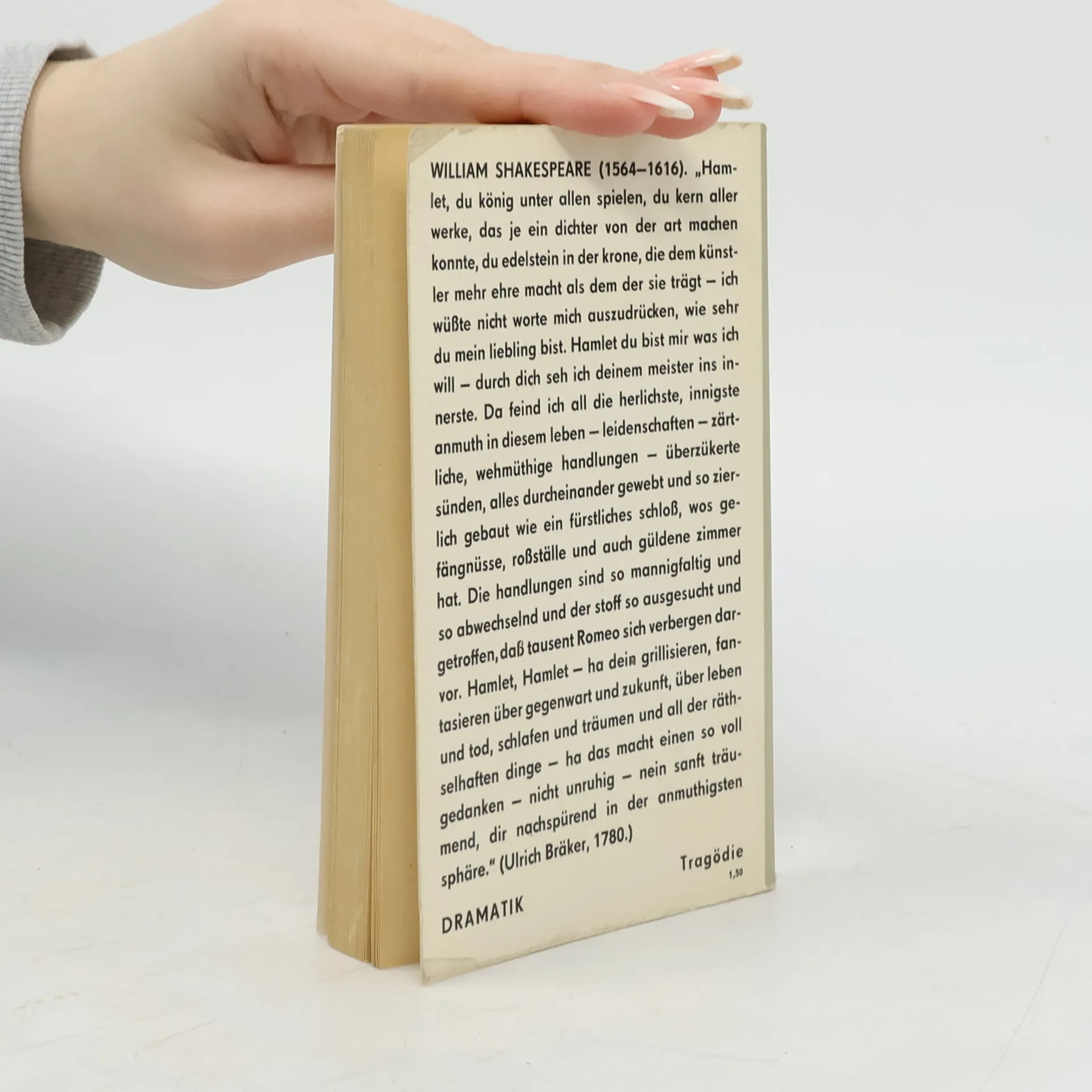 Dieses Drama um den dänischen Königssohn Hamlet gehört wohl zu den bekanntesten Dramen überhaupt. Hamlet ist zum Prototyp des Zauderers geworden, „dem der Intellekt die Tat zersetzt“. „Der Sprachkünstler und Sprachschöpfer Shakespeare scheint sich im Hamlet sein Ebenbild geschaffen zu haben. Denn wie keine andere Gestalt Shakespeares weiß Hamlet auf dem Instrument der Sprache wie auf einer Orgel mit mehreren Manualen und Registern zu spielen.“ Das Leseheft umfasst neben dem ungekürzten Text in der Übersetzung August Wilhelm von Schlegels (durchgängige Vers-/Zeilenzählung) ein Nachwort, einen Abschnitt zu Shakespeares Biografie, bibliografische Hinweise, Johann Wolfgang von Goethes Aufsatz “Shakespeare und kein Ende” sowie Anmerkungen bzw. Wort- und Sacherläuterungen.