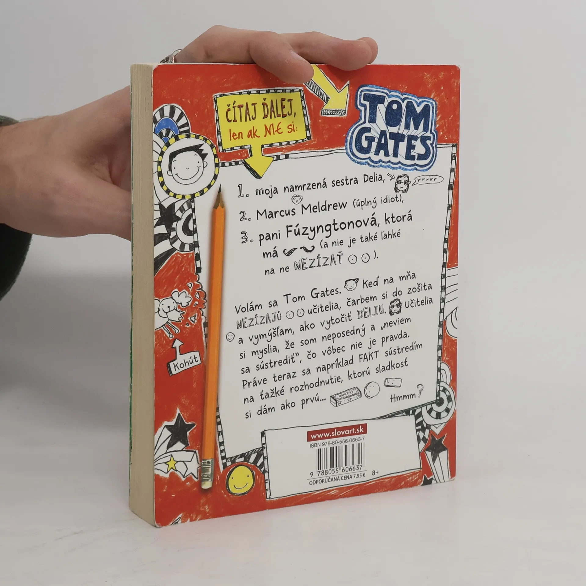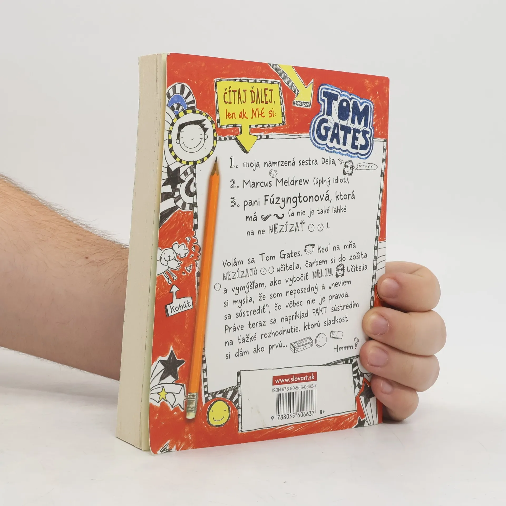 Neskúšajte čítať túto knihu na verejnosti. Budete sa totiž nahlas rehotať! Tom Gates je majstrom výhovoriek, expert na čarbanice a výnimočný tvorca komiksových príbehov. Je tiež nočnou morou pre svojho nevrlého triedneho učiteľa pána Fullermana. V jeho uletenom denníku plnom čarbaníc a nezmyslov nájdete všetky druhy komiksových čarbačiek. Podarí sa niekedy Tomovi spraviť načas domácu úlohu, vyhnúť sa hnevu svojho učiteľa – a urobiť dojem na Amy Porterovú, ktorá sedí vedľa neho?