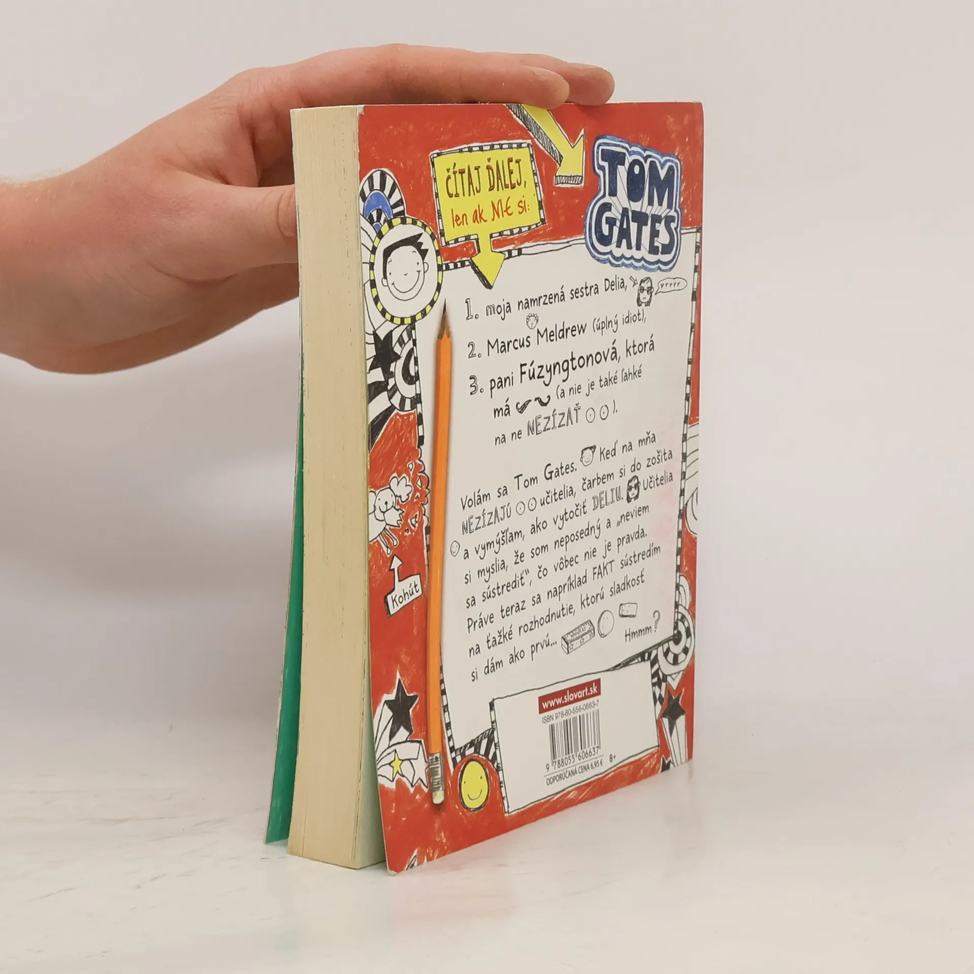 Neskúšajte čítať túto knihu na verejnosti. Budete sa totiž nahlas rehotať! Tom Gates je majstrom výhovoriek, expert na čarbanice a výnimočný tvorca komiksových príbehov. Je tiež nočnou morou pre svojho nevrlého triedneho učiteľa pána Fullermana. V jeho uletenom denníku plnom čarbaníc a nezmyslov nájdete všetky druhy komiksových čarbačiek. Podarí sa niekedy Tomovi spraviť načas domácu úlohu, vyhnúť sa hnevu svojho učiteľa – a urobiť dojem na Amy Porterovú, ktorá sedí vedľa neho?