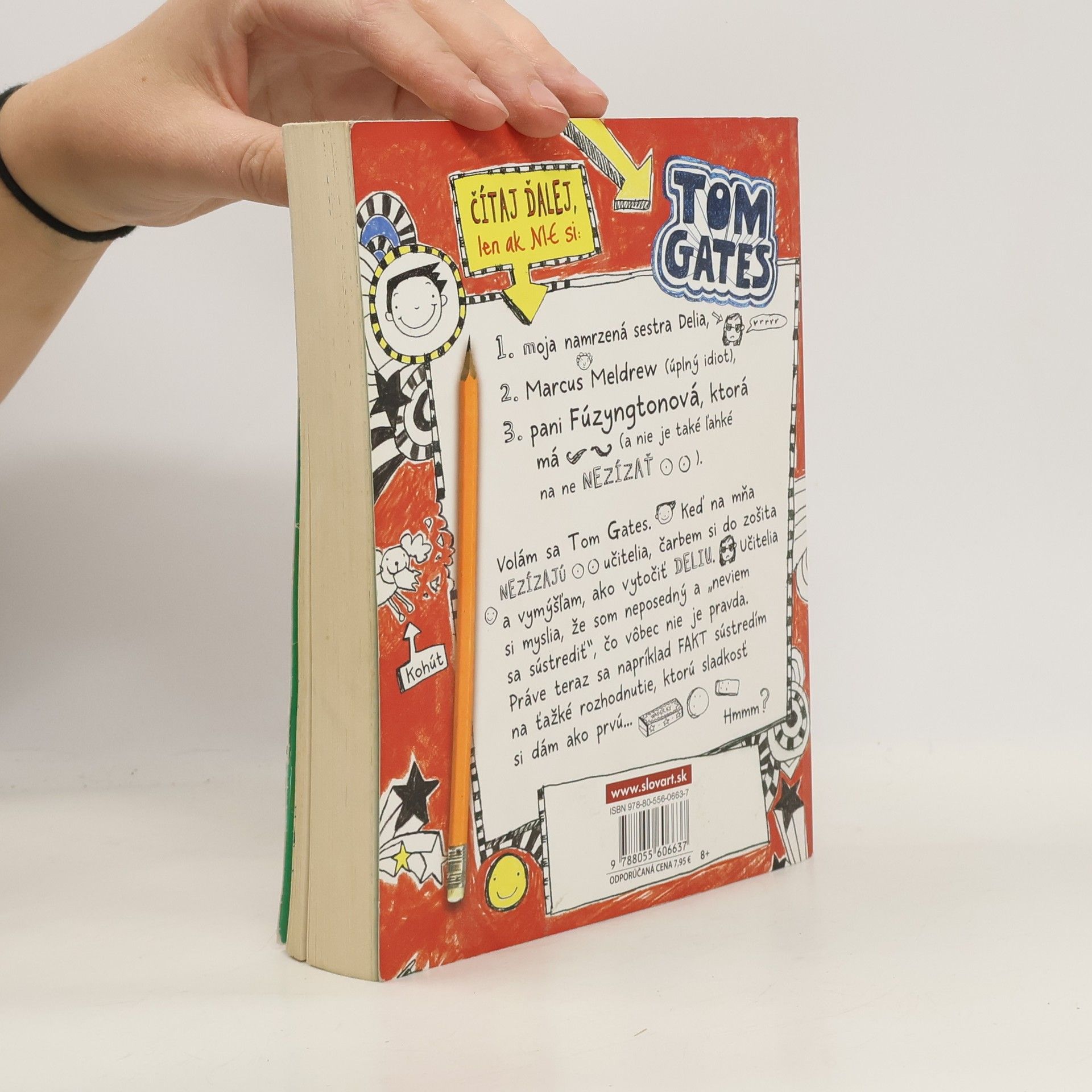 Neskúšajte čítať túto knihu na verejnosti. Budete sa totiž nahlas rehotať! Tom Gates je majstrom výhovoriek, expert na čarbanice a výnimočný tvorca komiksových príbehov. Je tiež nočnou morou pre svojho nevrlého triedneho učiteľa pána Fullermana. V jeho uletenom denníku plnom čarbaníc a nezmyslov nájdete všetky druhy komiksových čarbačiek. Podarí sa niekedy Tomovi spraviť načas domácu úlohu, vyhnúť sa hnevu svojho učiteľa – a urobiť dojem na Amy Porterovú, ktorá sedí vedľa neho?