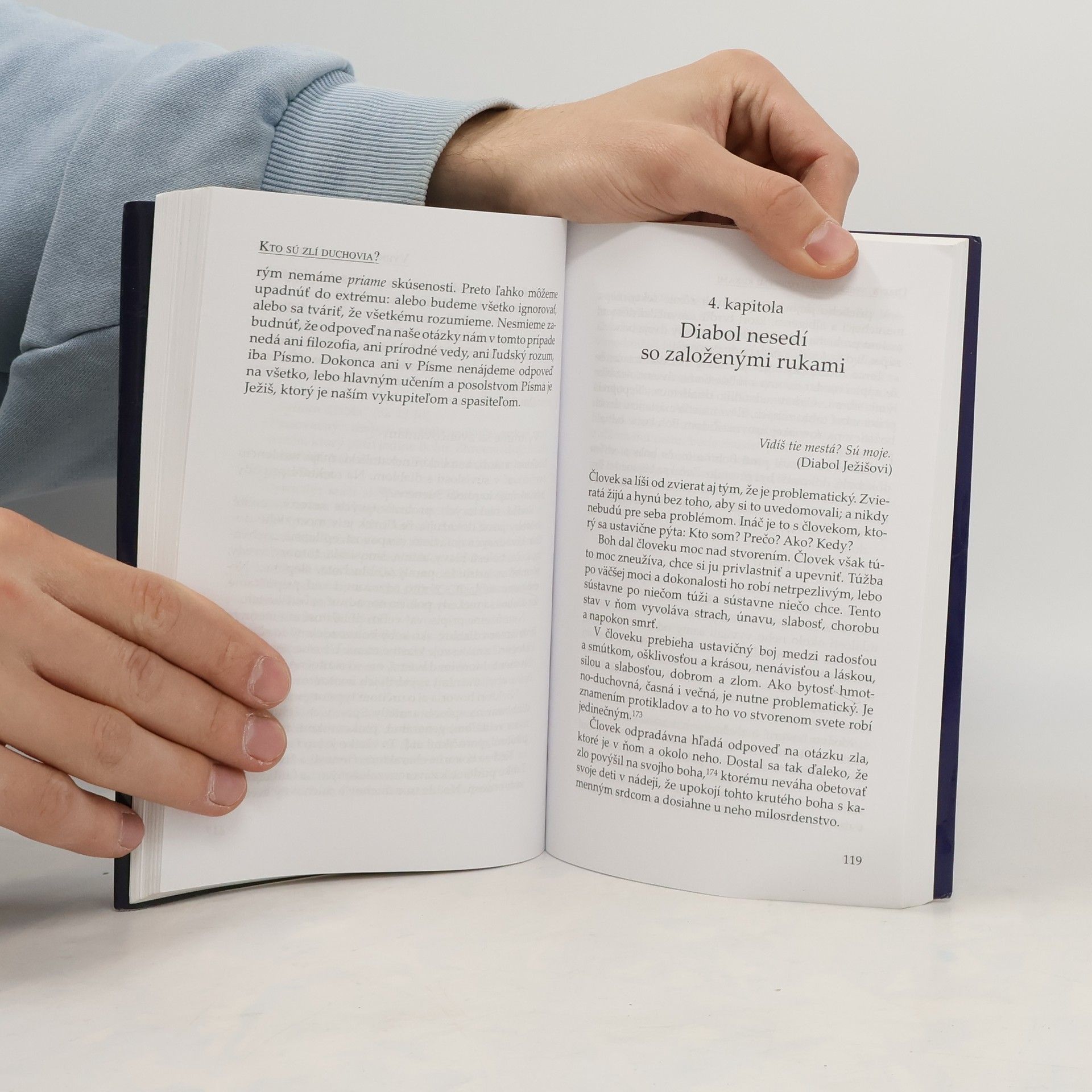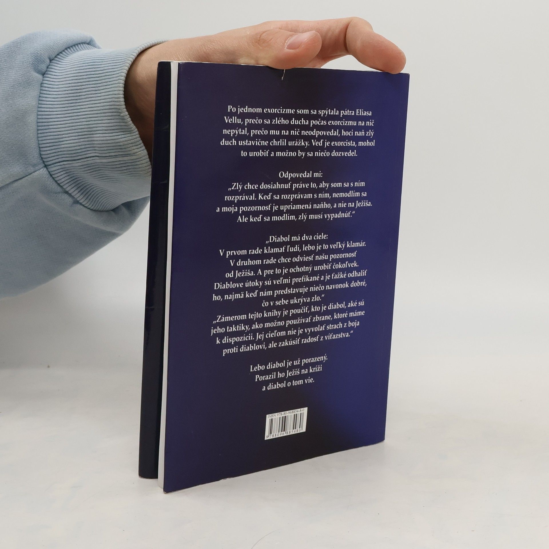Na jednom exorcizme som sa spýtala pátra Eliasa Vellu, prečo sa zlého ducha počas exorcizmu na nič nepýtal, prečo mu na nič neodpovedal, hoci naň zlý duch ustavične chrlil urážky. Veď je exorcista, mohol to urobiť a možno by sa niečo dozvedel. Odpovedal mi: „Zlý chce dosiahnuť práve to, aby som sa s ním rozprával. Keď sa rozprávam s ním, nemodlím sa a moja pozornosť je upriamená naňho, a nie na Ježiša. Ale keď sa modlím, zlý musí vypadnúť.“ „Diabol má dva ciele: V prvom rade klamať ľudí, lebo je to veľký klamár. V druhom rade chce odviesť našu pozornosť od Ježiša. A pre to je ochotný urobiť čokoľvek. Diablove útoky sú veľmi prefíkané a je ťažké odhaliť ho, najmä keď nám predstavuje niečo navonok dobré, čo v sebe ukrýva zlo.“ „Zámerom tejto knihy je poučiť, kto je diabol, aké sú jeho taktiky, ako možno používať zbrane, ktoré máme k dispozícii. Jej cieľom nie je vyvolať strach z boja proti diablovi, ale zakúsiť radosť z víťazstva.“ Lebo diabol je už porazený. Porazil ho Ježiš na kríži a diabol o tom vie. Z maltského originálu Satana do angličtiny preložili Dorothy Darmanin a Diane Mule´Stagno. Tretie upravené vydanie