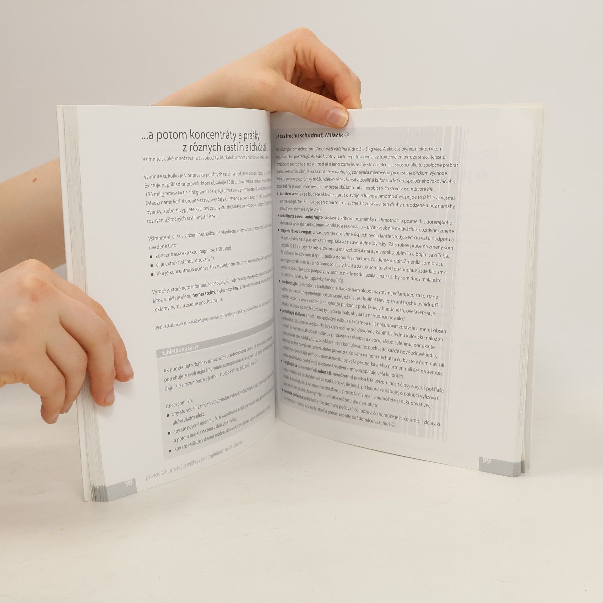 Kniha čítavým, vtipným a ľahko ironickým spôsobom, ale aj trpezlivo a chápavo reaguje na súčasnú záplavu diét a rôznych informácií o chudnutí a výživových doplnkoch na chudnutie. Text je rozdelený do dvoch základných línií, ktoré sa vzájomne prelínajú a dopľňajú: Príbehy: vás prevedú tými najdôležitejšími zákutiami ľudského tela a duše, aby ste sa lepšie zoznámili so sebou a svojou situáciou pri chudnutí. Nájdete tu Príbeh vášho: chudnutia, neúspechu, tráviaceho systému, metabolizmu, leptínu, mozgu, spánku, váženia, aj Príbeh vašich diét a svalov. Pravdy a klamstvá: prinášajú komentár autora – lekára k najčastejším tvrdeniam o nadváhe, obezite a chudnutí, ktoré sa za posledné 3 roky objavili v časopisoch, na internete a v príbalových letákoch výživových doplnkov. Autor je v mnohých prípadoch až nečakane priamy a osobný. Nájdete tu Pravdy a klamstvá o: bleskových diétach, tukoch, bielkovinách, cukroch a umelých sladidlách, glykemickom indexe, výživových doplnkoch na chudnutie, raňajkách, večeri, cvičení, pitnom režime, trávení aj Pravdy a klamstvá o psychike, motivácií, pevnej vôli a detoxikácií.