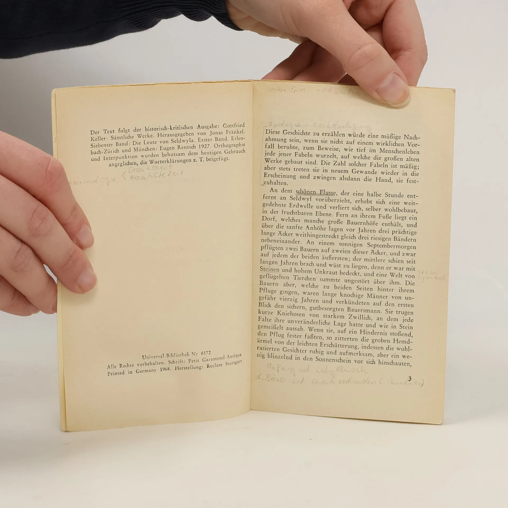 Das Thema von Romeo und Julia, das bis ins 15. Jahrhundert zurückgeht und durch Shakespeare seine bedeutendste Gestaltung fand (Hamburger Leseheft Nr. 128), verlegt Keller ins dörfliche Milieu. Wiederholt wurde die Liebesgeschichte als die „schönste deutsche Dorfgeschichte“ bezeichnet. Die feindlichen Väter von Sali und Vrenchen widersetzen sich den Gefühlen der beiden Liebenden zueinander. Als sie für ihre Liebe keine Zukunft sehen können, scheiden die beiden leichten Herzens gemeinsam aus dem Leben. Das ausführliche Nachwort enthält den ursprünglichen, längeren Schluss der Erzählung sowie eine Abhandlung über das Leben des Dichters und dieses Werk. Die Worterklärungen sind alphabetisch geordnet.