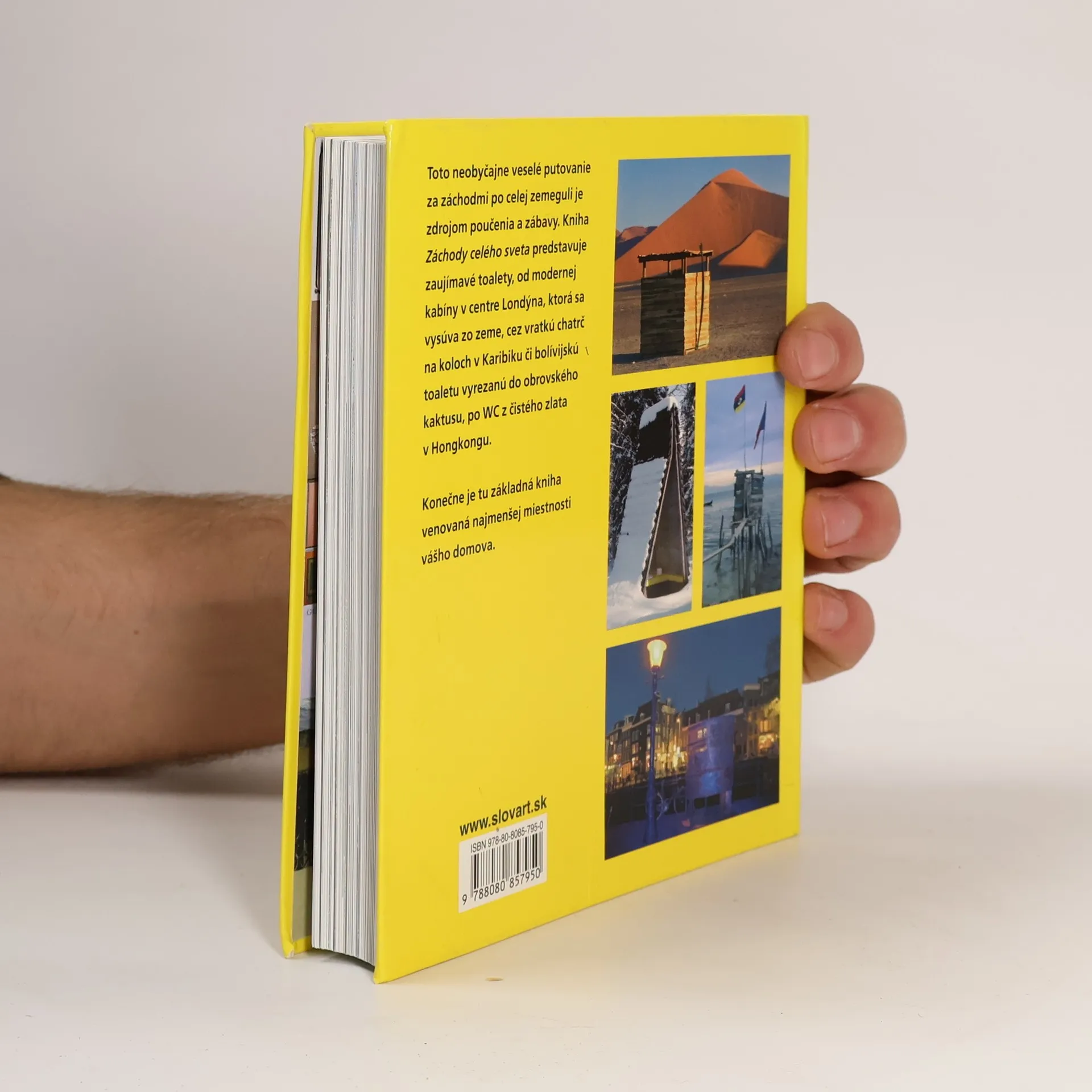 Toto neobyčajne veselé putovanie za záchodmi po celej zemeguli je zdrojom poučenia a zábavy. Kniha Záchody celého sveta predstavuje zaujímavé toalety, od modernej kabíny v centre Londýna, ktorá sa vysúva zo zeme, cez vratkú chatrč na koloch v Karibiku či bolívijskú toaletu vyrezanú do obrovského kaktusu, po WC z čistého zlata v Hongkongu. Konečne je tu základná kniha venovaná najmenšej miestnosti vášho domova.