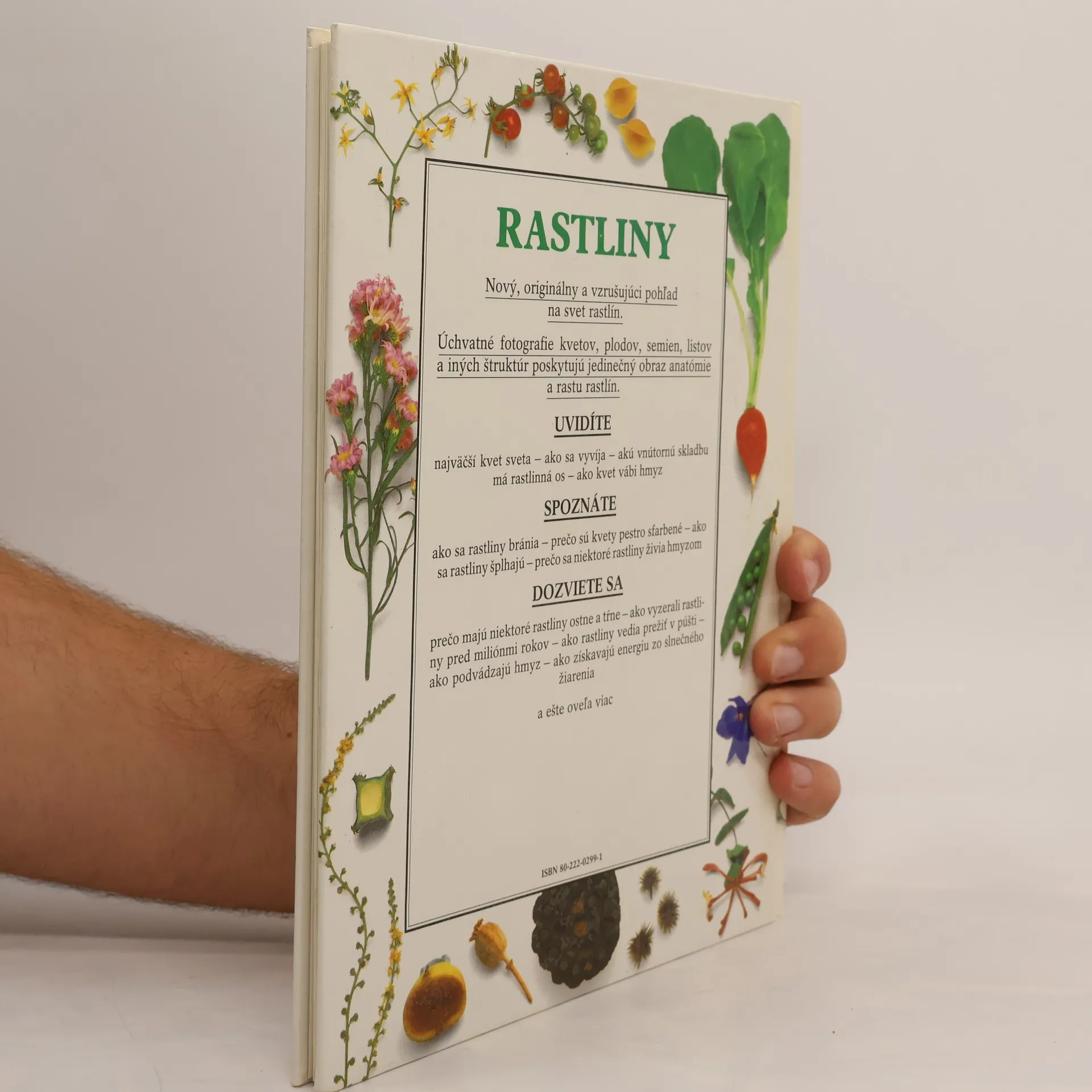Spoznajte fascinujúci svet rastlín-ich stavbu, rozmanitosť a spôsob života. Nový, originálny a vzrušujúci pohľad na svet rastlín. Úchvatné fotografie kvetov, plodov, semien, listov a iných štruktúr poskytujú jedinečný obraz anatómie a rastu rastlín. Kapitoly: Čo je rastlina ?, Z čoho sa skladá rastlina ?, Zrodenie rastliny, Rastlina rozkvitá, Rastliny žijú zo svetla, Skladba jednoduchého kvetu, Zložitý kvet, Rôzne typy kvetov, Opelenie, Zvláštni opeľovači, Od kvetu k plodu, Ako sa šíria semená, Unášané vetrom, Rastliny sa šíria i bez semien, Živé listy, Sebaobrana, Popínavé rastliny, Mäsožravé rastliny, V pasci, Cudzopasné rastliny, Podnájomníci, Prispôsobenie sa životu vo vode, V ríši snehu, Život bez vody, Rastlina ako potrava, História pšenice, Liečivé a jedovaté rastliny, Zberatelia rastlín, Zbierky rastlín. Prvé vydanie.