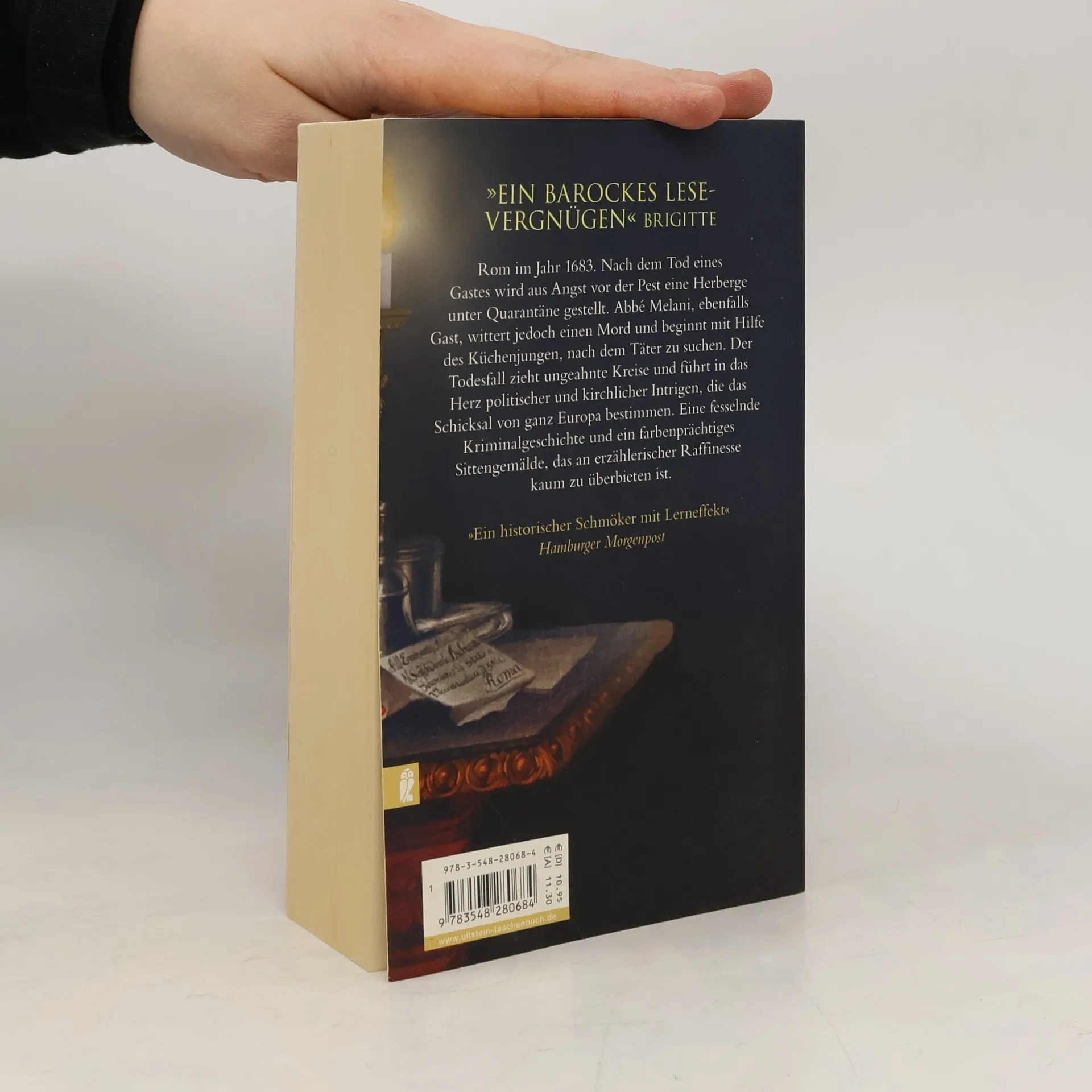 Rom im Jahr 1683. Nach dem Tod eines Gastes wird aus Angst vor der Pest eine Herberge unter Quarantäne gestellt. Abbé Melani, ebenfalls Gast, wittert jedoch einen Mord und beginnt mit Hilfe des Küchenjungen, nach dem Täter zu suchen. Der Todesfall zieht ungeahnte Kreise und führt in das Herz politischer und kirchlicher Intrigen, die das Schicksal von ganz Europa bestimmen. Eine fesselnde Kriminalgeschichte und ein farbenprächtiges Sittengemälde jener Zeit, das an erzählerischer Raffinesse kaum zu überbieten ist.