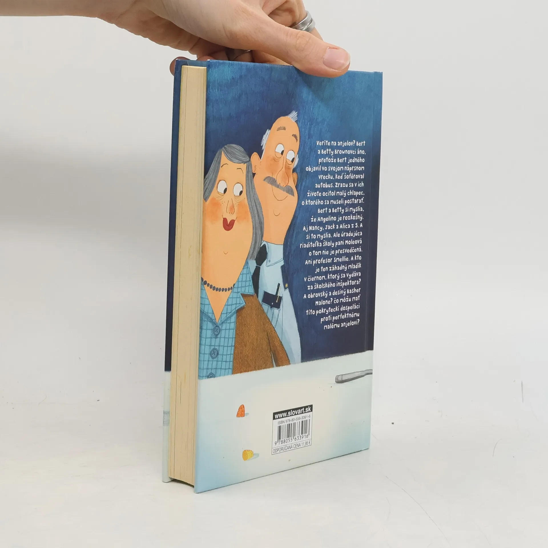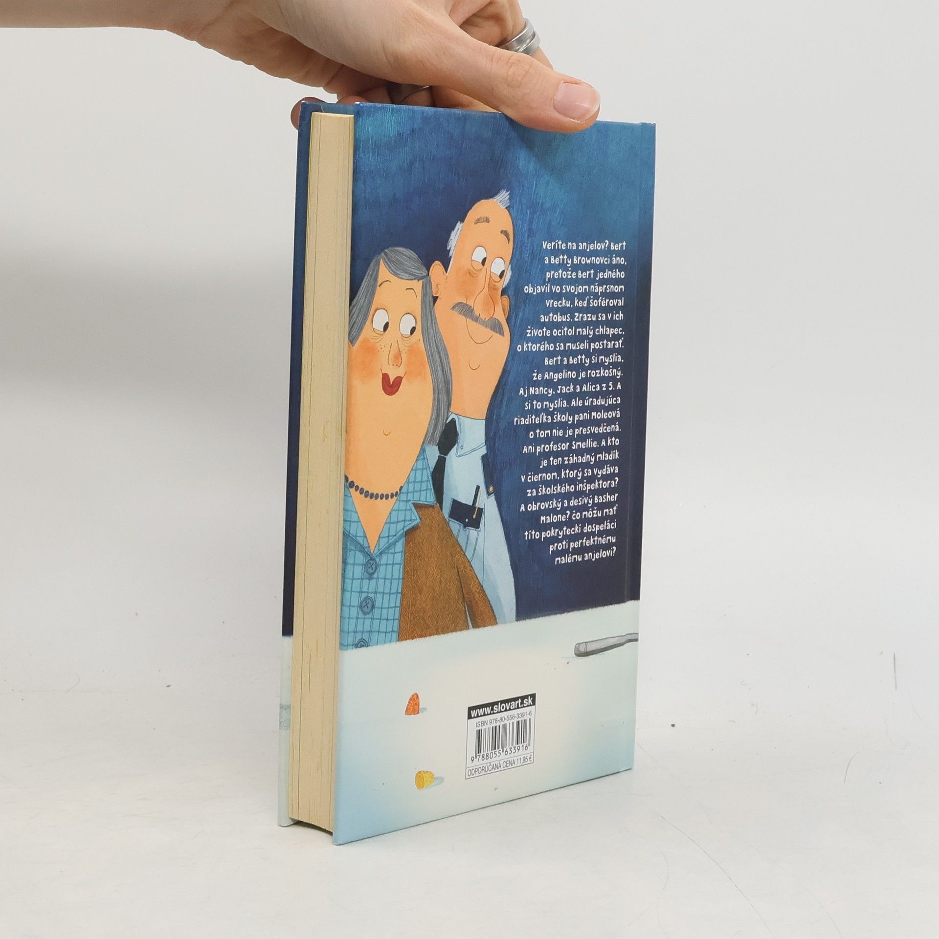 Vtipný a láskyplný príbeh rozprávačského majstra, autora oceňovaného Skelliga a O chlapcovi, ktorý plával s piraňami. Počas jazdy v autobuse objavil Bert Brown vo svojom náprsnom vrecku anjela. Podľa Berta a Betty je rozkošný. Aj pre Nancy, Jacka a Alicu z 5.A. Ale úradujúca riaditeľka školy pani Moleová si to nemyslí. Ani profesor Smellie. A čo záhadný mladík, ktorý sa vydáva za školského inšpektora? Ten človek je mimoriadne podozrivý. A ešte je tu veľký, ťažkopádny Basher Malone. Nemá Angelina rád. Vlastne robí všetko pre to, aby ho dostal...