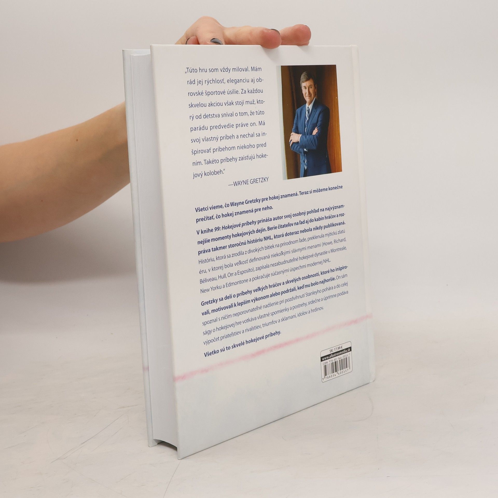 Všetci vieme, čo Wayne Gretzky pre hokej znamená. Teraz si môžeme konečne prečítať, čo hokej znamená pre neho. V knihe 99: Hokejové príbehy prináša autor svoj osobný pohľad na najvýznamnejšie momenty hokejových dejín. Berie čitateľov na ľad aj do kabín hráčov a rozpráva takmer storočnú históriu NHL, ktorá doteraz nebola nikdy publikovaná. Gretzky sa delí o príbehy veľkých hráčov a skvelých osobností, ktoré ho inšpirovali, motivovali k lepším výkonom alebo podržali, keď mu bolo najhoršie.