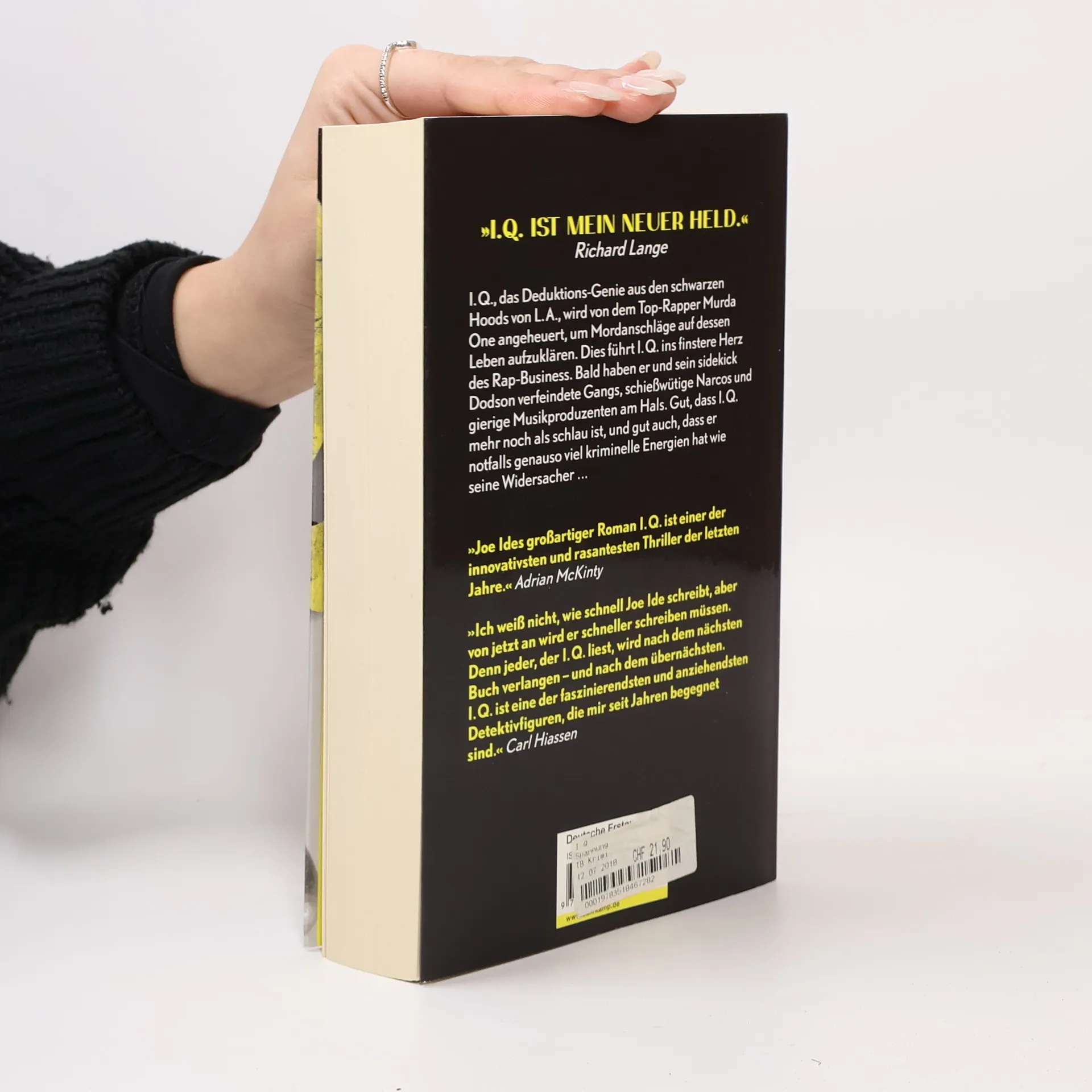 I.Q. nennt man Isaiah Quintabe in den schwarzen Hoods von Los Angeles. Weil er ein Genie ist und weil er als eine Art Nachbarschaftsdetektiv ohne Lizenz den »kleinen Leuten« zu ihrem Recht verhilft. Oder wenn das schwierig ist, immerhin zu Gerechtigkeit, Genugtuung und Entschädigung. Zusammen mit seinem sidekick, dem schlagfertigen Gangsta Dodson, wird er wider Willen von dem Top-Rapper Murda One angeheuert, um Mordanschläge auf dessen Leben aufzuklären. Das führt ins finstere Herz des Rap-Business, wo sich jede Menge wunderliche und tödliche Gestalten tummeln: Gangsta Rapper, Bitches, Anwälte, Auftragskiller, Drogenbosse, Big-Business-Leute und Medienvolk. Bald haben es I.Q. und Dodson mit verfeindeten Gangs, schießwütigen Narcos und gierigen Musikproduzenten zu tun. Gut, dass I.Q. ein Weltmeister der Deduktion ist, und gut auch, dass er notfalls genauso viel kriminelle Energien hat wie seine Widersacher. Oder noch mehr … »Joe Ides Debütroman ist der fulminante Auftakt einer wahnsinnig hinreißenden Krimiserie über einen ziemlich schlauen Kerl und das packend beschriebene kriminelle Umfeld, in dem er sich bewegt.« Janet Maslin, The New York Times