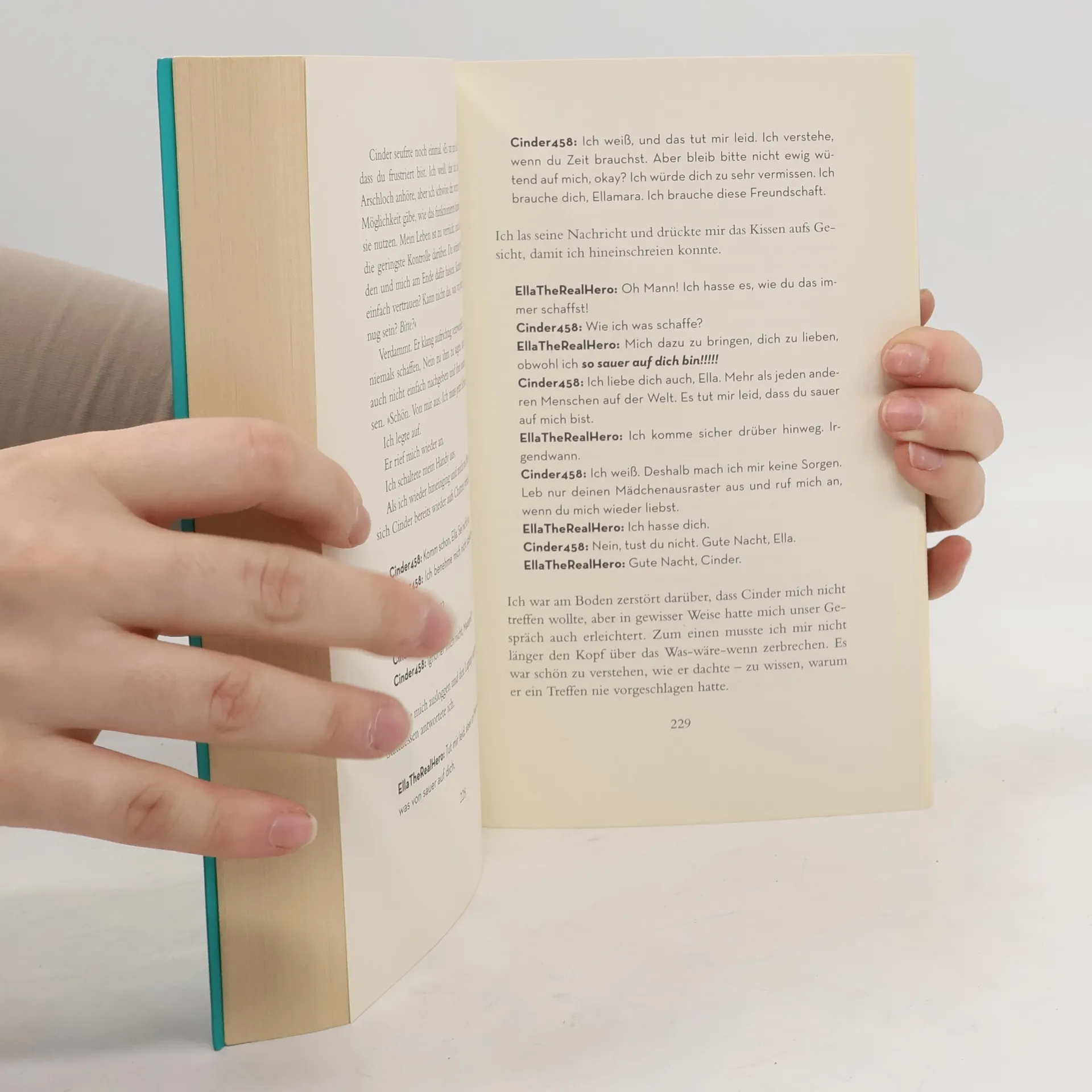 Ein sehr schöner, romantischer Roman, der eigentlich für Teenager gedacht ist. Er hat mir mit über 60 Jahre sehr gefallen und mich in das Geschehen von Cinder und Ella mitgenommen. Sodass ich mir gleich noch den Band 2 bestellt habe.