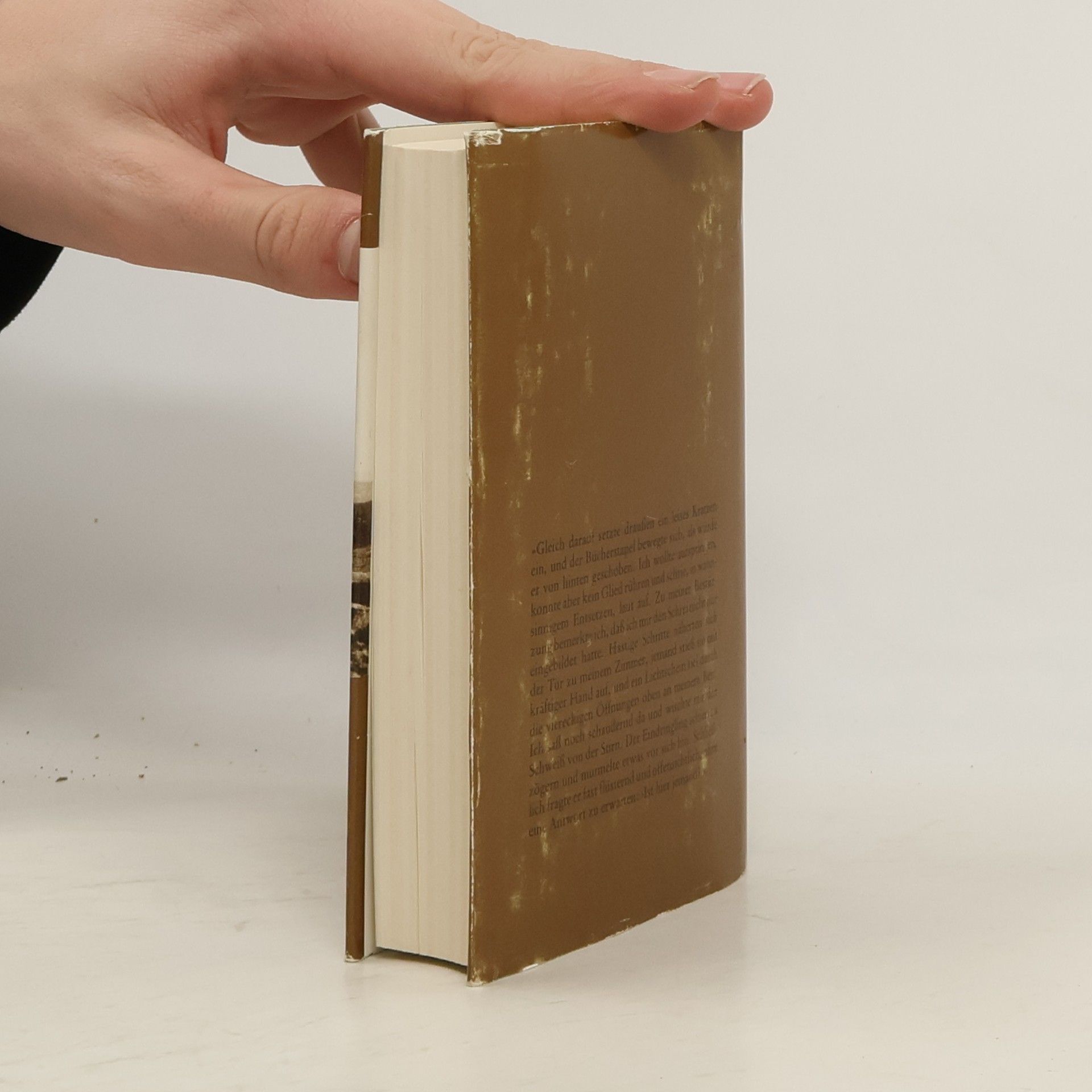 Gleich darauf setzte draussen ein leises Kratzen ein, und der Bücherstapel bewegte sich, als würde er von hinten geschoben. Ich wollte aufspringen, konnte aber kein Glied rühren und schrie, in wahnsinnigem Entsetzen, laut auf. Zu meiner Bestürzung bemerkte ich, dass ich mir den Schrei nicht nur eingebildet hatte. Hastige Schritte näherten sich der Tür zu meinem Zimmer, jemand stiess sie mit kräftiger Hand auf, und ein Lichtschein fiel durch die viereckigen Öffnungen oben an meinem Bett. Ich sass noch schaudernd da und wischte mir den Schweiss von der Stirn. Der Eindringling schien zu zögern und murmelte etwas vor sich hin. Schliesslich fragte er fast flüsternd und offensichtlich, ohne eine Antwort zu erwarten: Ist hier jemand?